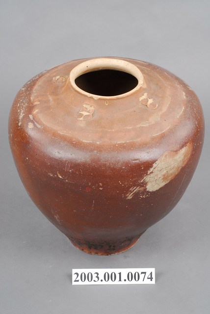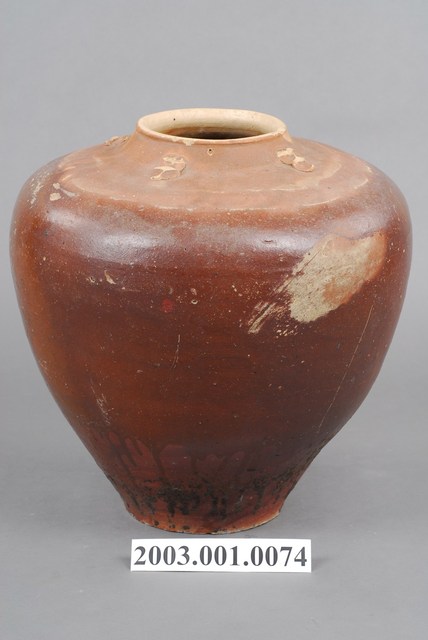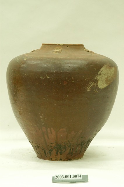 小口,豎頸,斜肩,近口處有四繫,繫鈕扁平並有三道突稜,肩部有兩圈支燒痕,寬肩之下斜收,凹底。外壁施醬釉,施釉不及底,胎色灰褐,胎質夾砂。清代福建、廣東地區製品。