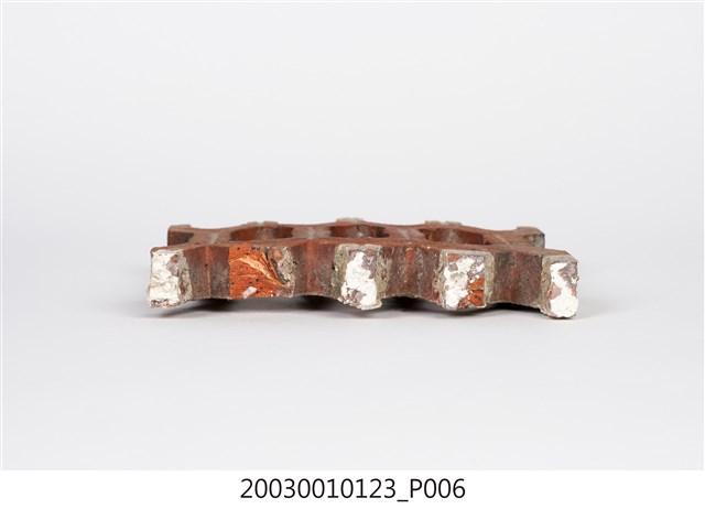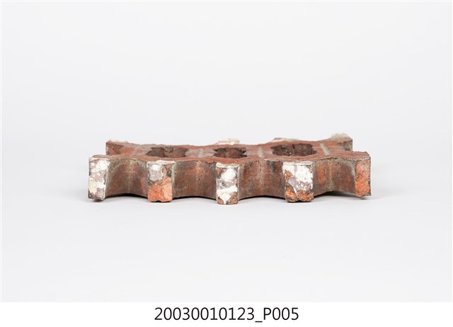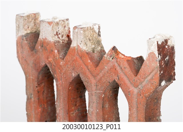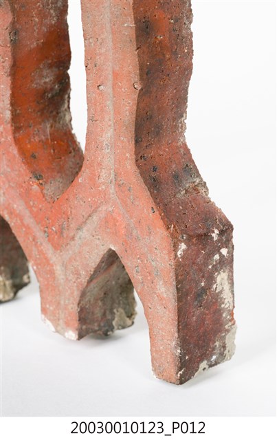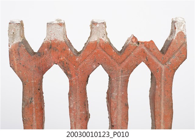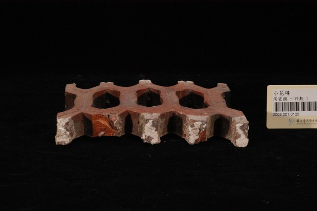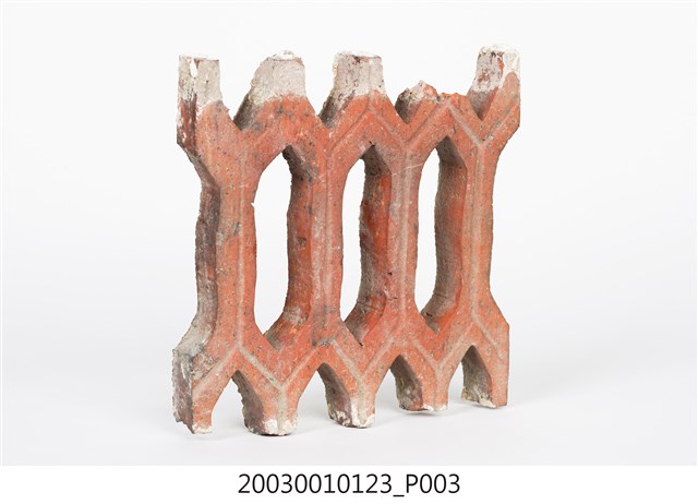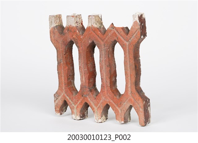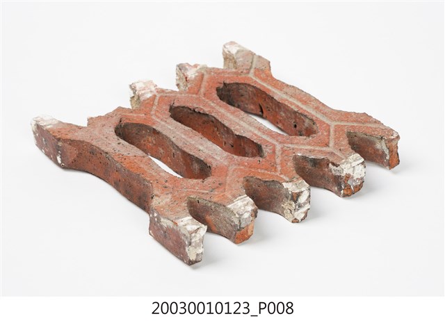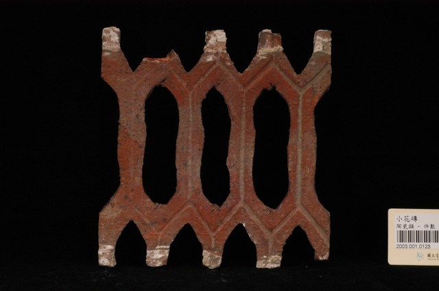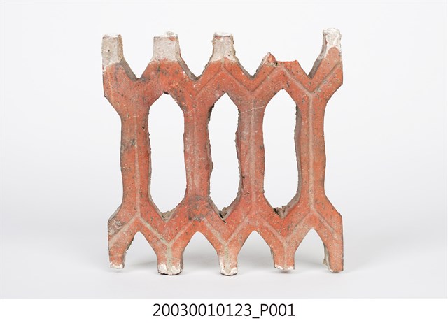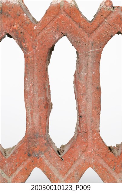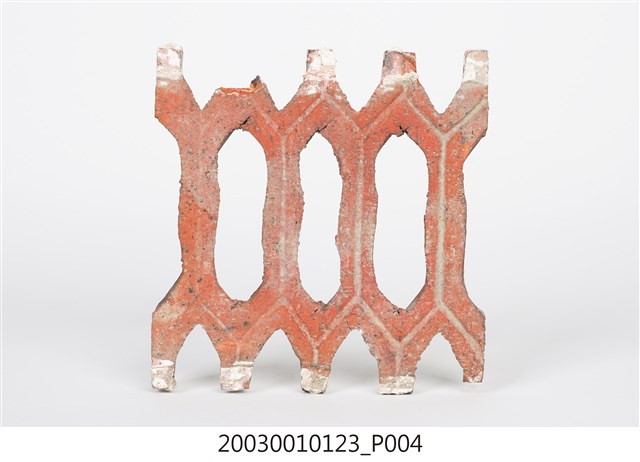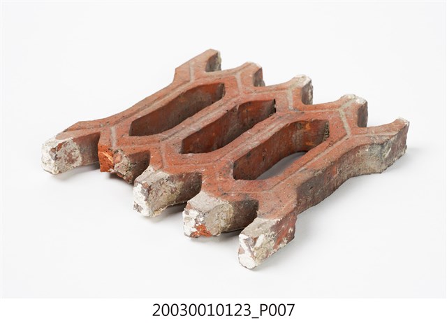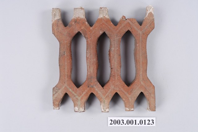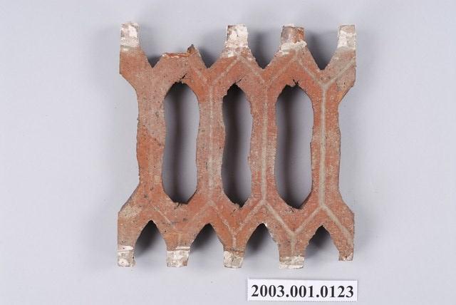 柳條磚取其線條似柳葉形而名之,又稱柳葉磚,是鏤空花磚的一種。為紅色素燒磚。最常見的是以中間三個相連的完整中空長六角形,兩側為半個長六角形組成,通常長寬各約15公分,本件尺寸亦同。本件柳條磚中間為三個長六角形,正反面皆有陰刻六角形線條。柳條磚用於漢式傳統廟宇或民居的氣窗或屋脊,可減輕屋脊重量或增加屋內的通風採光,通常以多塊並列,形成連續龜甲圖案。本件磚局部破損不存,邊緣白色灰泥為與建築黏附痕跡。