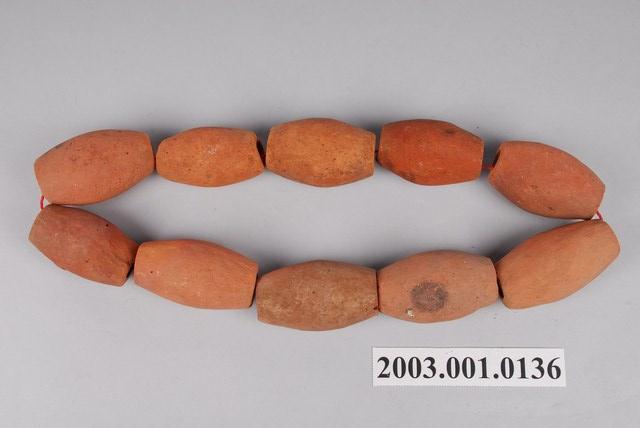 1.此物件為陶製網墜,為一細繩以及10顆沉子串連組合而成的漁具,沉子為陶製品,沉子為中空橢圓狀,沉子的表面有陶製品專有的燒製痕跡。 2.網墜是繫於漁具下方使得漁具能下沉於水面之下的一種漁具,為了能沉於水下通常採用密度較高的物質製成,如石材、陶瓷、金屬等。