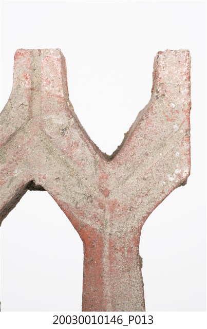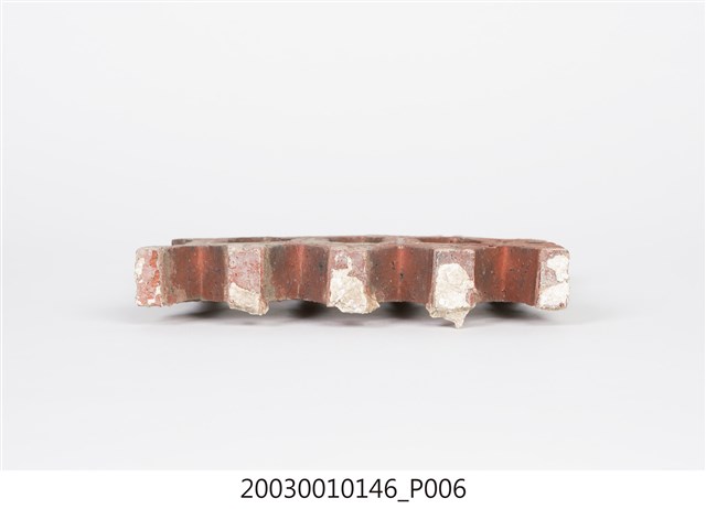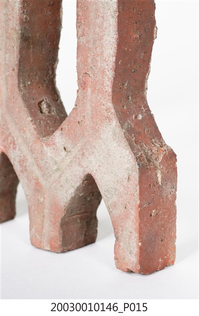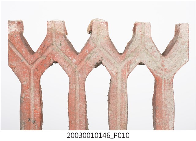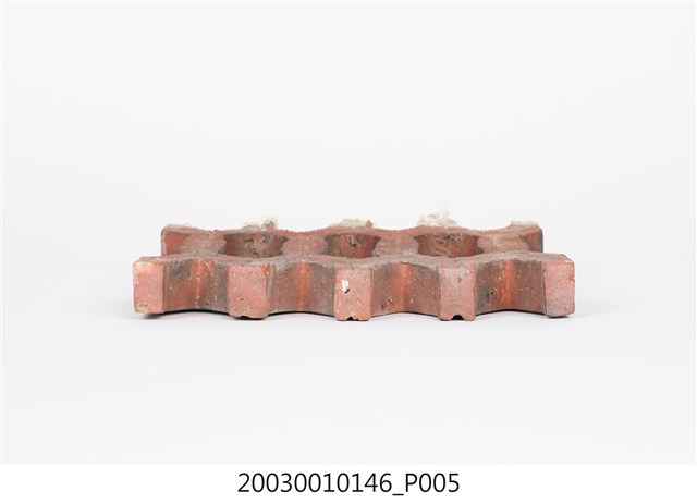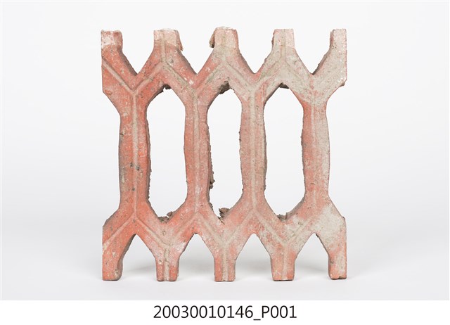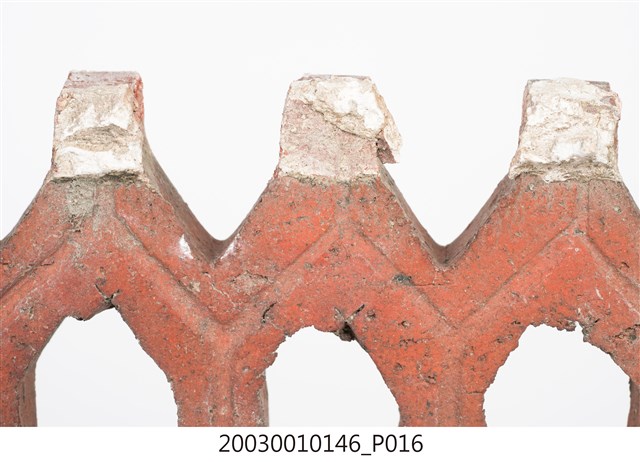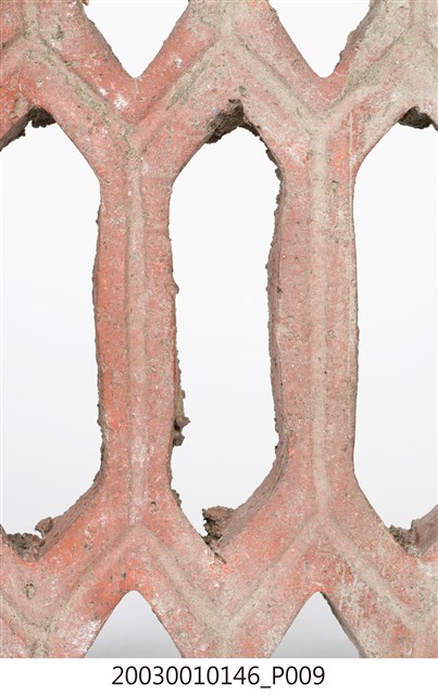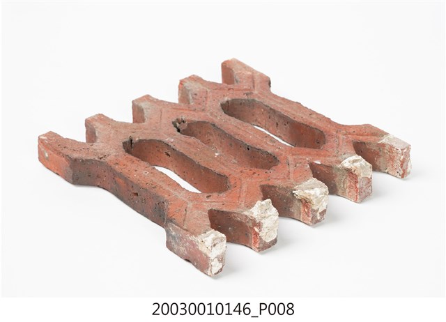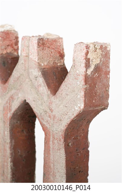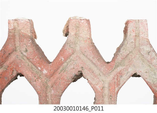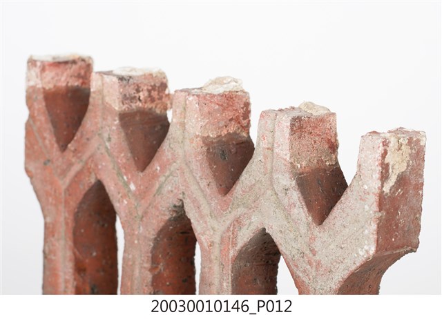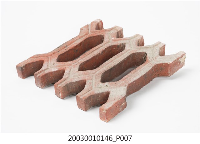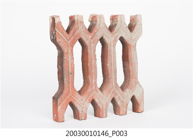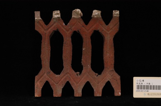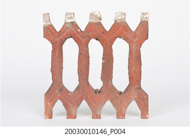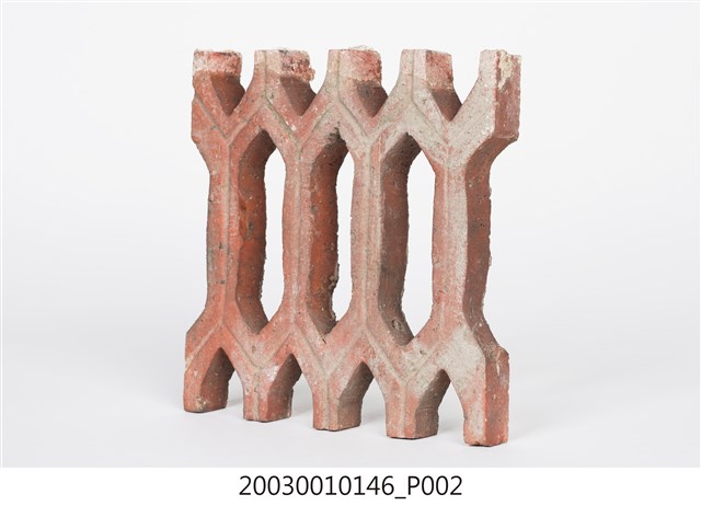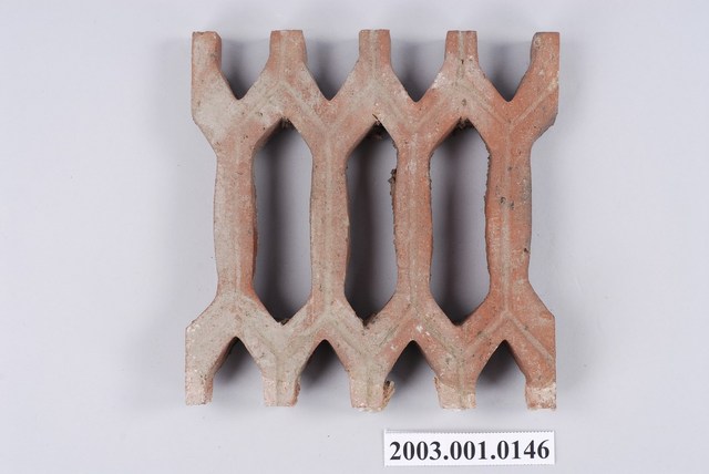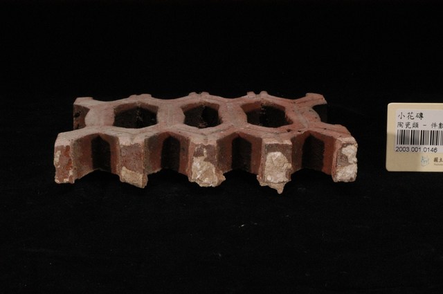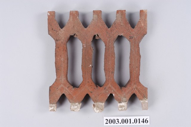 柳條磚取其線條似柳葉形而名之,又稱柳葉磚,是鏤空花磚的一種。為紅色素燒磚。最常見的是以中間三個相連的完整中空長六角形,兩側為半個長六角形組成,通常長寬各約15公分,本件尺寸亦同。本件柳條磚中間為三個長六角形,正反面皆有陰刻六角形線條。柳條磚用於漢式傳統廟宇或民居的氣窗或屋脊,可減輕屋脊重量或增加屋內的通風採光,通常以多塊並列,形成連續龜甲圖案。本件磚邊緣白色灰泥為與建築黏附痕跡。