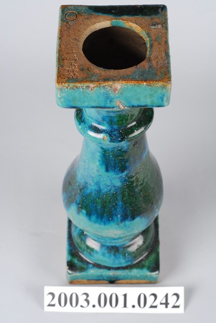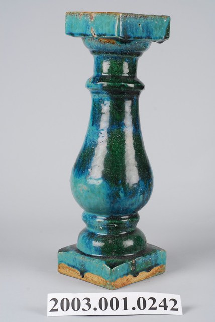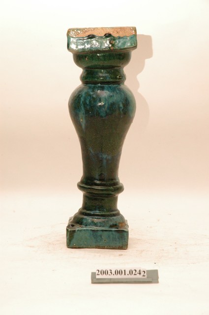 本件文物為綠釉花瓶欄杆。為模具陶燒製品,表面上綠釉,採低溫燒製。綠釉花瓶欄杆通常用於街屋牌樓面的二樓陽臺,或頂部牌樓,仍與紅磚搭配。欄杆頂部刻有「石灣 吳鴻玉祥記」文字,應為製造商商號,或為廣東石灣商號。並有圓圈記號,可能是批次記號。