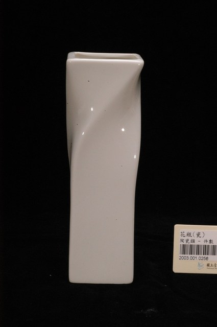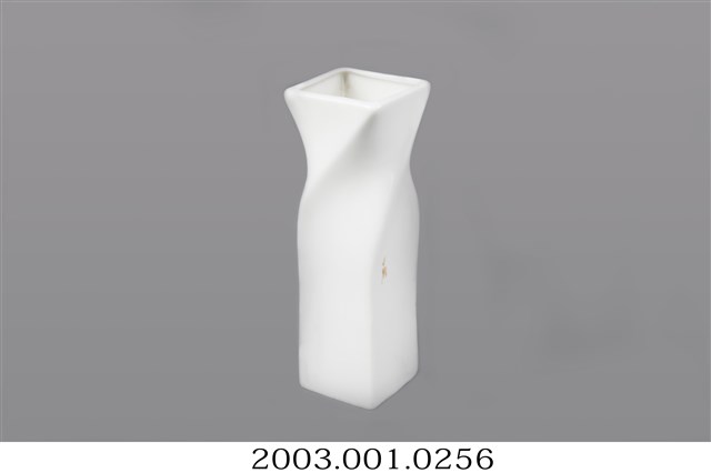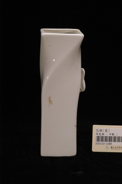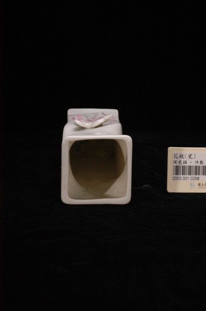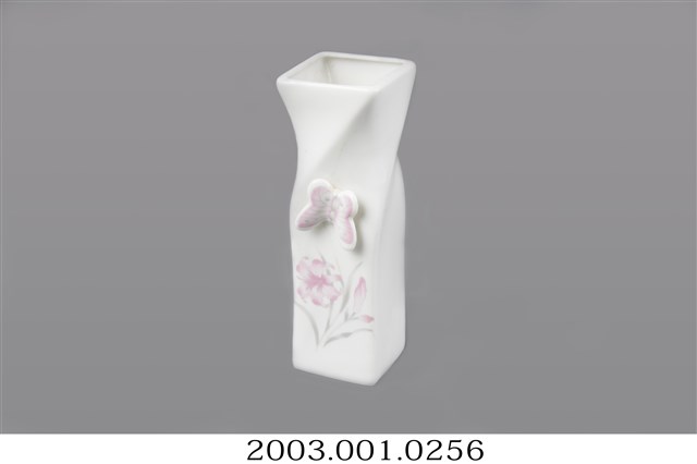 本件蝴蝶貼花百合方瓶主要作花器擺設使用,長5公分,寬5.5公分,高15.5公分。外型呈現方柱狀瓶,頸部絞轉後,帶螺旋紋。外觀為潔白瓷器,僅單面作裝飾,以蝴蝶外型瓷土片採貼花工法,固定於器身頸部,後以粉色蝴蝶轉印貼於其身,另外貼花蝴蝶下方,同樣採轉印方式貼上粉色百合花。本件方瓶與2003.001.0255之三角瓶採相同圖案相同技法製作,應為關聯器。
