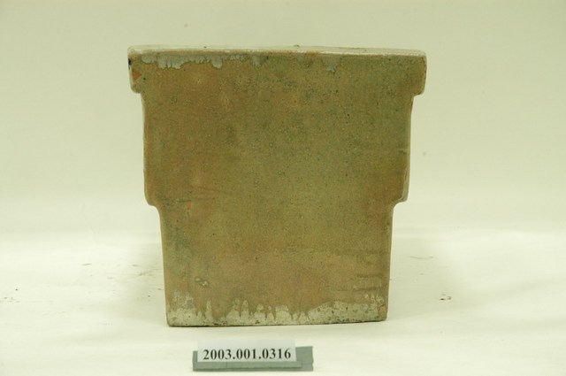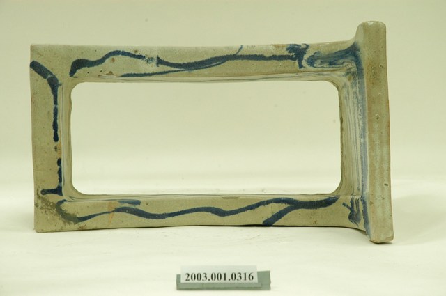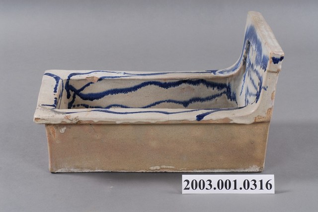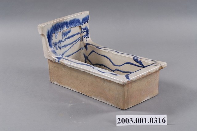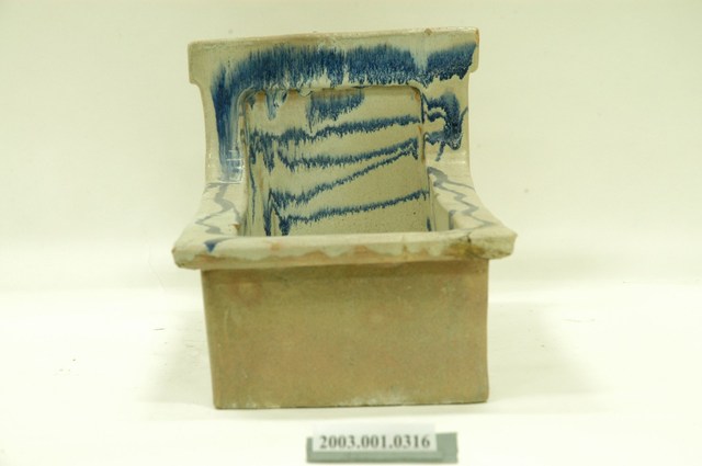 1.此為青花瓷馬桶,器長49.6公分,寬29.4公分,高28.5公分,器形長方狀,中間底部簍空,瓷土燒製而成。短側邊有方形山牆,肩部向內凹。器腹四方向外折沿,底為白色瓷坯,繪以藍色鈷水波紋及簡單線條裝飾。器身內側四立面及口緣皆有上釉,外側立面無上釉,口緣接縫處多有上釉不均之情形,兩側長邊內緣皆有嚴重缺角,整體多有掉漆斑駁情形。2.青花瓷馬桶初期多來自日本,後期才出現臺灣工廠生產的款式,使用時將馬桶裝設在已挖好的糞管(坑)之上,器底簍空,故穢物直接掉落糞管(坑) 中,近似現代蹲式馬桶。此種設計與日治時期引進現代化公共衛生政策相關。青花瓷馬桶,作法是將氧化鈷繪於白色瓷坯上,燒製成藍色圖案的釉下彩瓷器,常以花草紋、水波紋裝飾,較陶製馬桶更顯高雅。