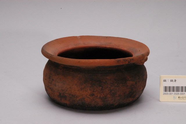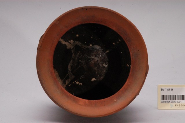 炊煮用陶鍋器身。子母口,束頸,圓鼓腹,平底。口緣處貼附雙繫耳。胎土呈紅褐色,摻雜粗砂粒,以拉坯成形,器腹拉坯弦紋明顯,全器素面無釉燒成,呈紅褐色,器面因受熱溫度不同,部分偏灰色。該件夾砂陶鍋器身外器壁一側,還留有節慶時的祈福春聯,大大的「福」字喜慶洋洋,記錄了普羅大眾的生活習俗。與器蓋2003.001.0324.0002配套。