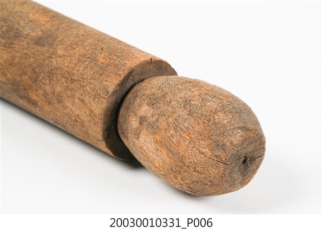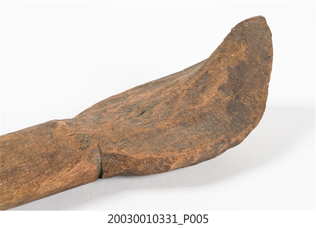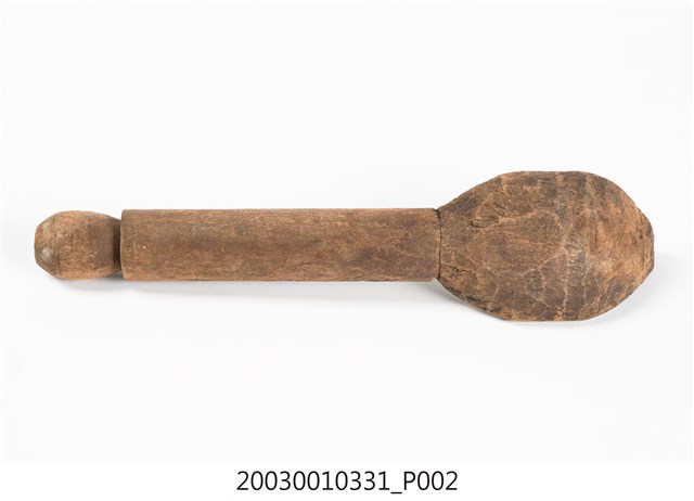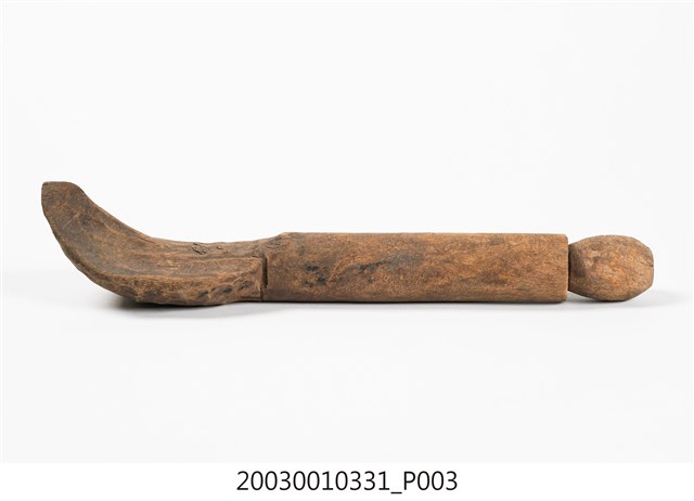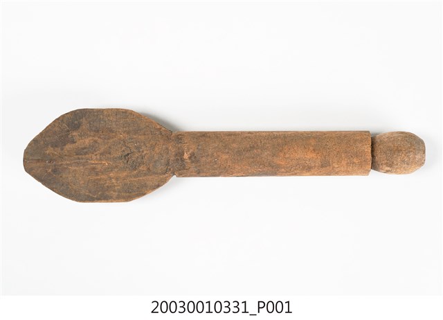 1.本件木匙係由整塊木頭一體成型雕刻而成,長31.6cm、寬7.5cm、高6.3cm,頗有厚重感,色澤呈現黃褐色,質地較為粗糙,前端椀部略呈橢圓,柄部較直為圓柱型,柄部尾端為一圓球型雕刻。本件柄部於椀部之間平行無曲度,椀部兩側邊緣亦呈平行無法盛裝液體,整體看似接近飯匙的形制,前端有一突起可能便利挖勺食物。本件造型樸質,著重其實用性功能未有其他雕刻裝飾。2.臺灣原住民族的日常飲食器具以天然材質製作為多,如竹、椰殼等。本件所屬族群不詳,一般來說,若為排灣族或魯凱族使用之木匙,常見柄部帶有雕刻,將飲食器具呈現出藝術美感。由於本件長及31.6公分,大於一般個人使用之木匙,可能作為舀飯菜之公匙。