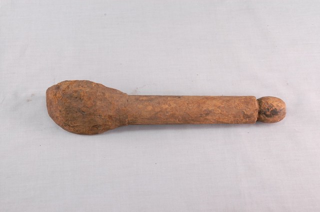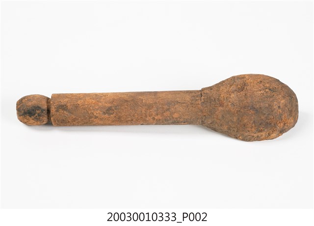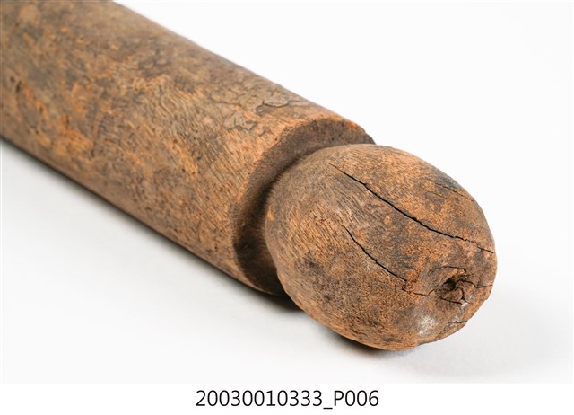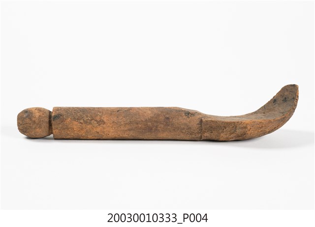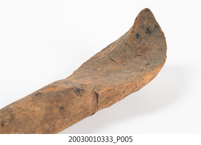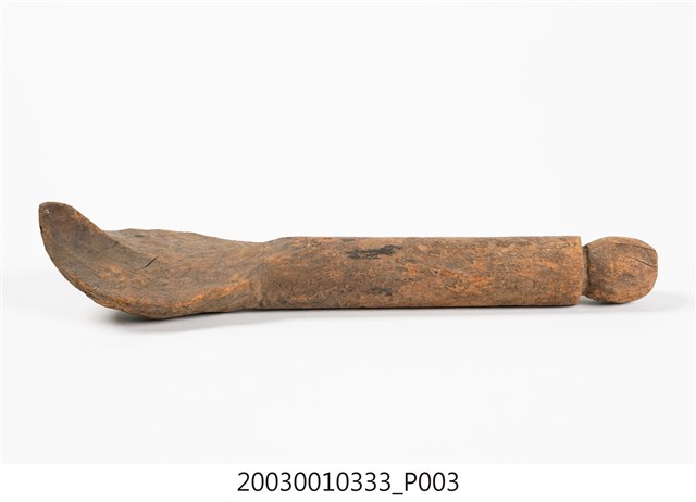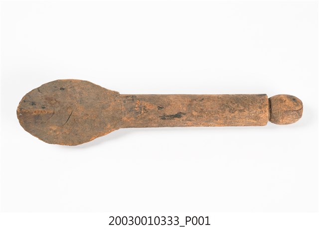 1.本件木匙係由整塊木頭一體成型雕刻而成,長30.7cm、寬7.1cm、高6cm,頗有厚重感,色澤呈現黃褐色,質地較為粗糙,前端椀部略呈橢圓,柄部較直為圓柱型,柄部尾端為一圓球型雕刻。本件柄部於椀部之間平行無曲度,椀部兩側邊緣亦呈平行無法盛裝液體,整體看似接近飯匙的形制,前端有一突起可能便利挖勺食物。本件造型樸質,著重其實用性功能未有其他雕刻裝飾。2. 臺灣原住民族的日常飲食器具以天然材質製作為多,如竹、椰殼等。本件所屬族群不詳,一般來說,若為排灣族或魯凱族使用之木匙,常見柄部帶有雕刻,將飲食器具呈現出藝術美感。由於本件長及30公分,大於一般個人使用之木匙,可能作為舀飯菜之公匙。