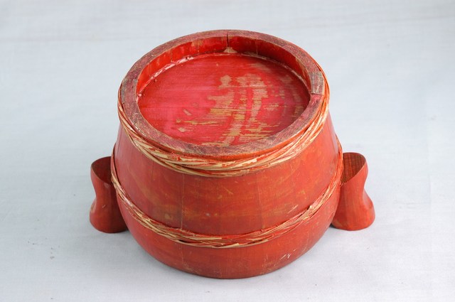 由十六塊木板一片一片圍攏起來的圓桶狀,上寬下瘦,中間稍微凸出呈大肚形,腹部與底部以竹篾編織成麻花狀圈起來,左右各有一凸出之耳朵形木塊作為把手,方便端移。桶身外側塗上朱紅色漆,內側保留原木色。