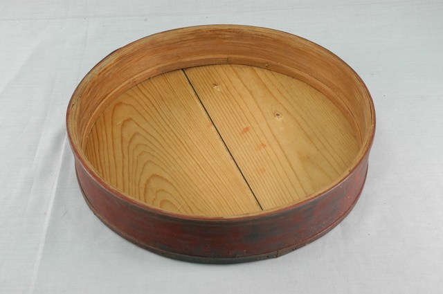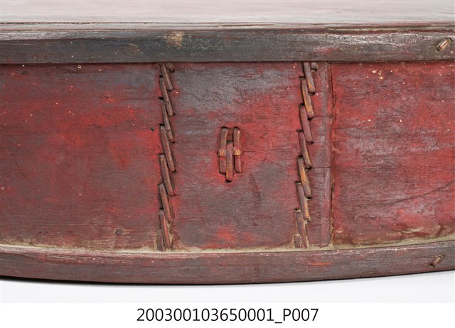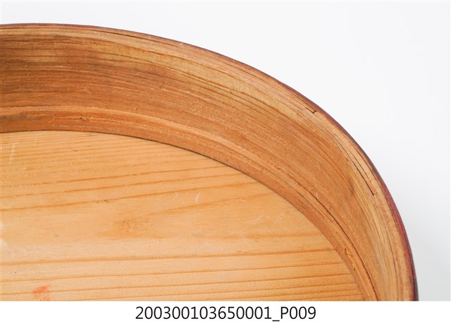 褐紅漆木製果盒上蓋,頂蓋由二片半圓形木板製成,四周以長條木片圍繞,呈扁圓筒狀,表面髹褐紅漆,內部無漆保持原木色,倒扣於層盒上方,防止飛蟲、灰塵等異物掉入盒中。