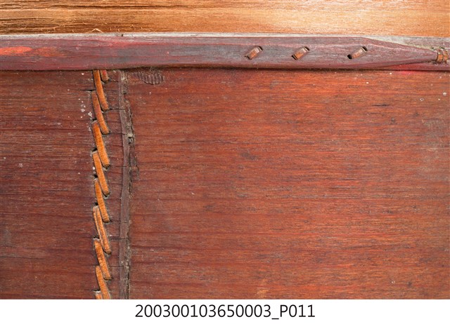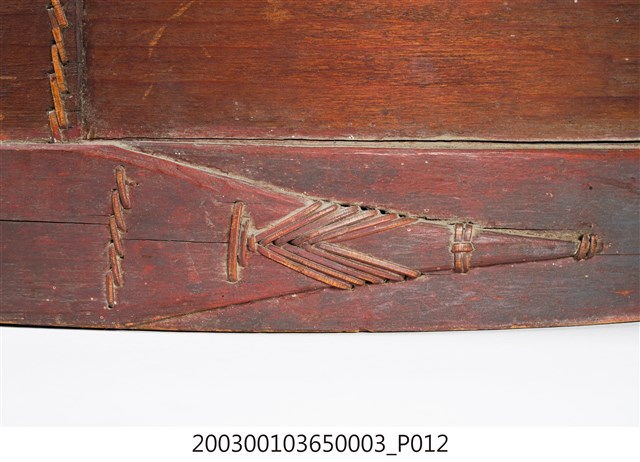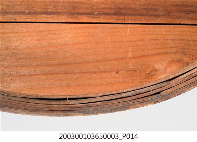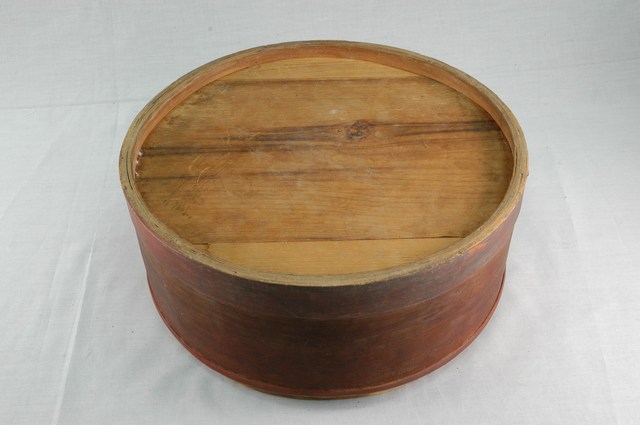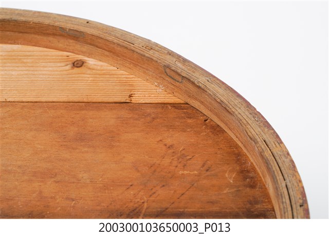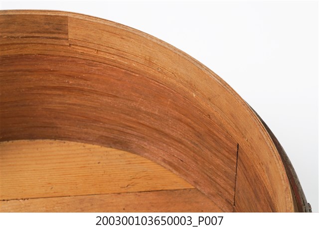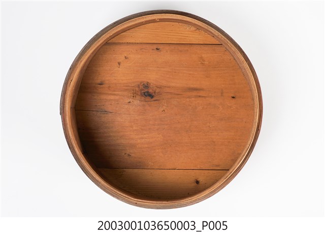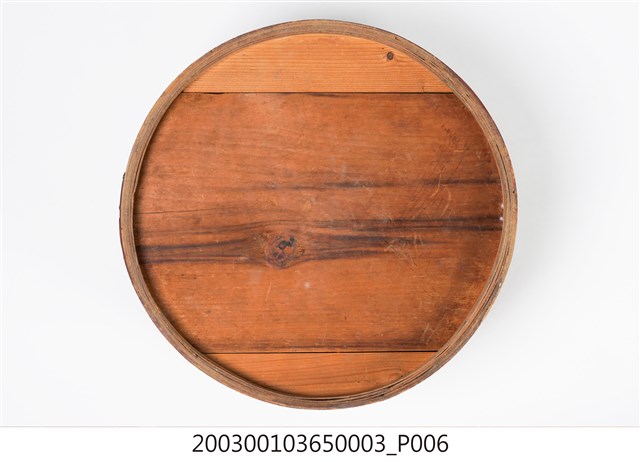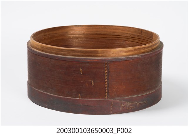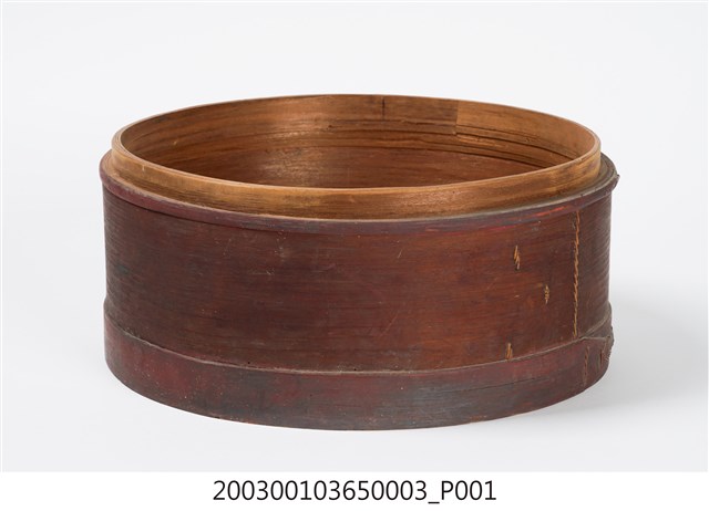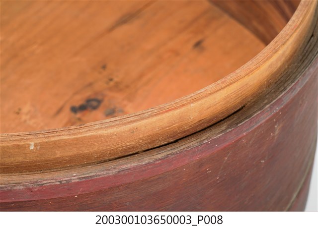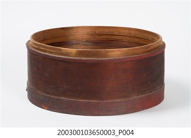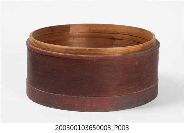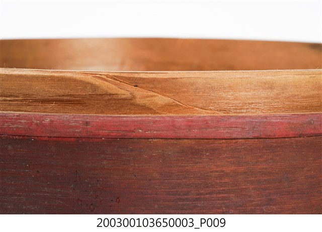 褐紅漆木製果盒下層,盒底由三片木板製成,四周以長條木片圍繞,呈圓筒狀,表面髹褐紅漆,內部無漆保持原木色,口沿略內縮向上凸起,可與中間層盒相接。