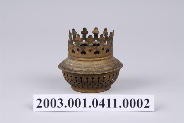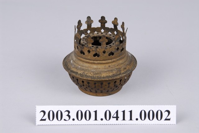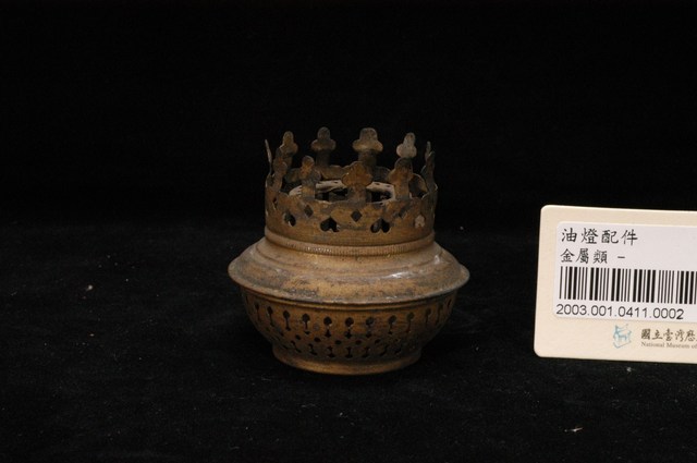 本件黃銅製煤油燈之燈芯頭罩為部件之2,通身以黃銅製作而成,外觀呈現上下透孔,四周鏤空的中空瓶形頭罩,其放置位置由燈芯控制之柱頭套入。頭罩作平口內折沿,短頸折肩,瓶身上寬下窄。內折沿以圓孔排列成環形,並以垂直匙紋透孔排列滿瓶身。另以銅片作成冠形放置於口部外層,頂端作十字形突出,其身帶菱形與心形透孔。頭罩之作用除了固定燈芯裝置,同時也提供玻璃燈罩承盤的放置處。為使燈芯燃燒順暢,頭罩部件多為鏤空處理,利於空氣對流。