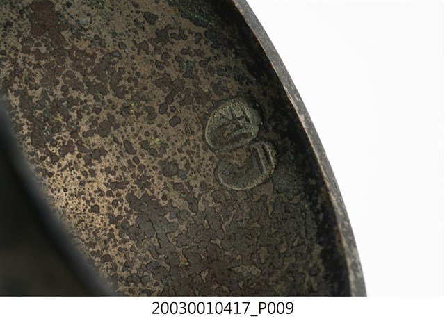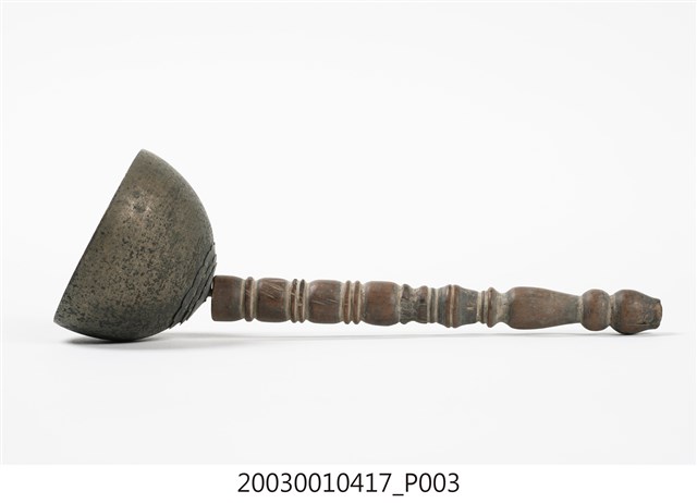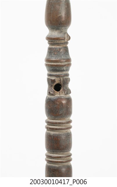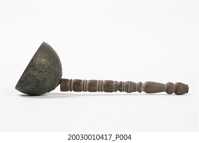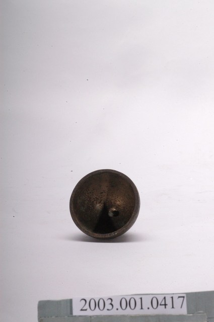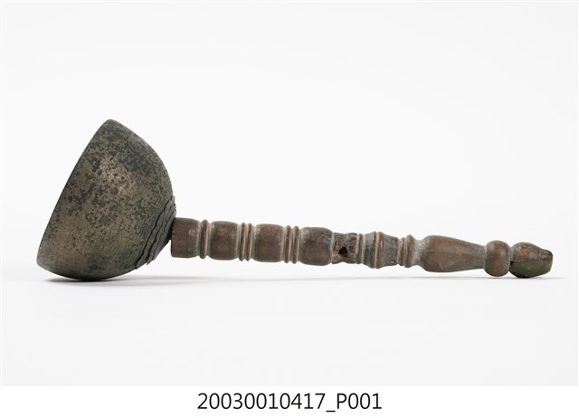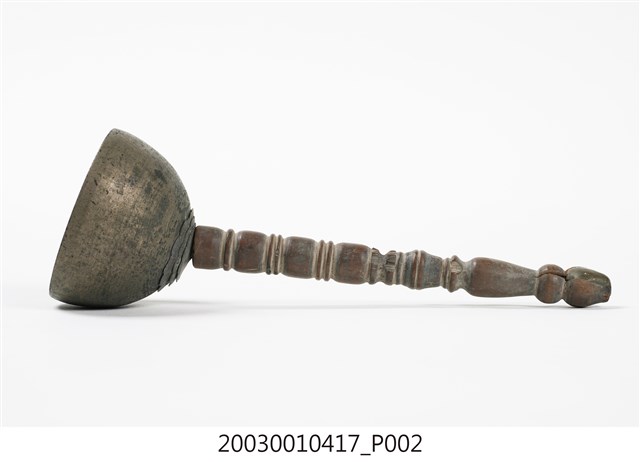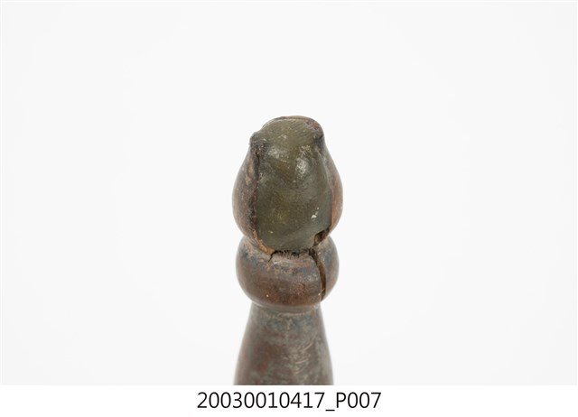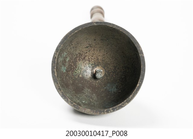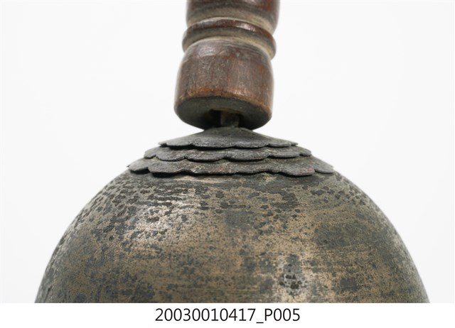 1.本件收藏品為金色覆缽形法鐘,長17.4公分,寬5.8公分,高5.7公分,器身呈現覆缽形,頂端連接有突出木質棒狀握把,握把刻成車枳欄杆柱狀。器身頂端與握把間,疊有三層花狀裝飾金屬片,其餘部分無裝飾,鐘腹內部無舌錘,但刻有雙卵形銘文「二利」。2.法鐘又稱法鈴,是傳統道教信仰常見之法器,附有握把方便施法者握持,握把頂端常做三叉形,具有「一炁化三清」的道教信仰意義。行科演法之時,手搖法鐘發出鈴聲,搭配儀式之進行,同時鈴聲也具有驅邪作用。