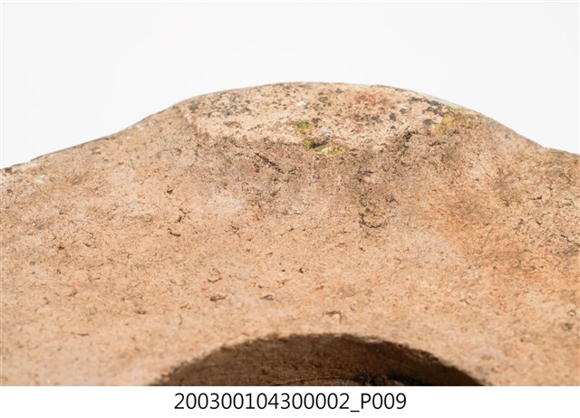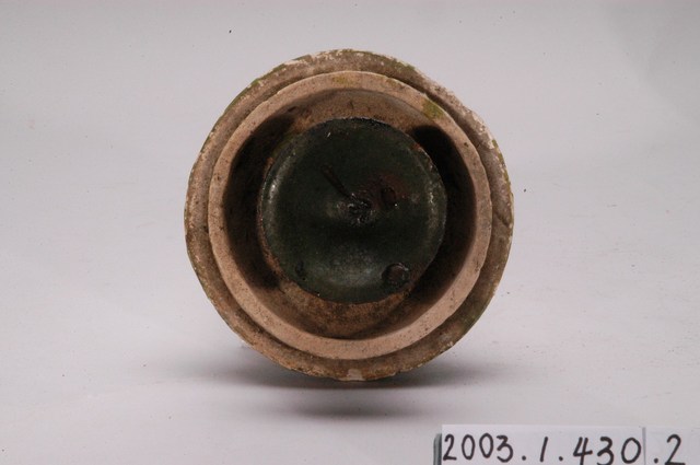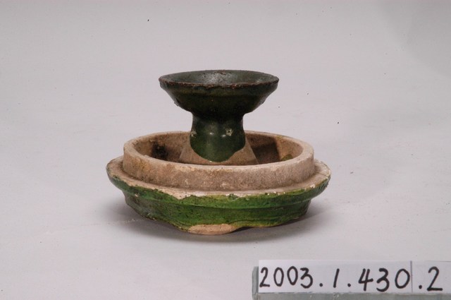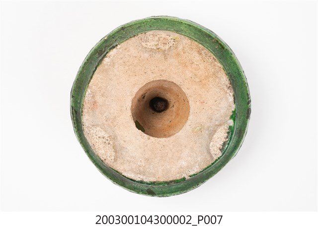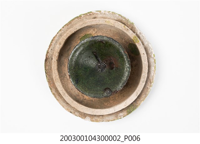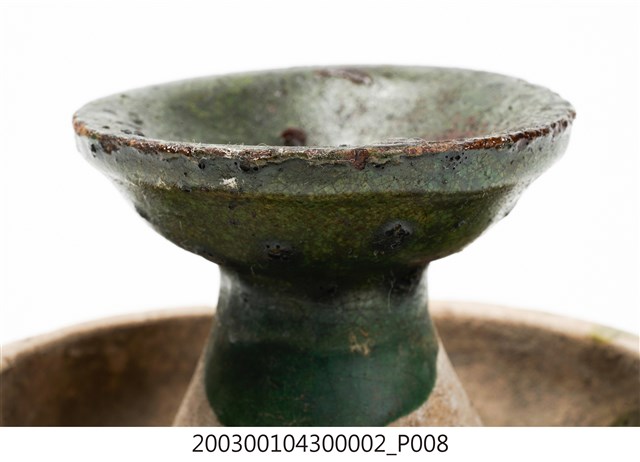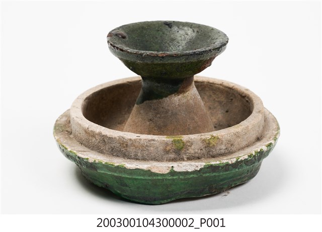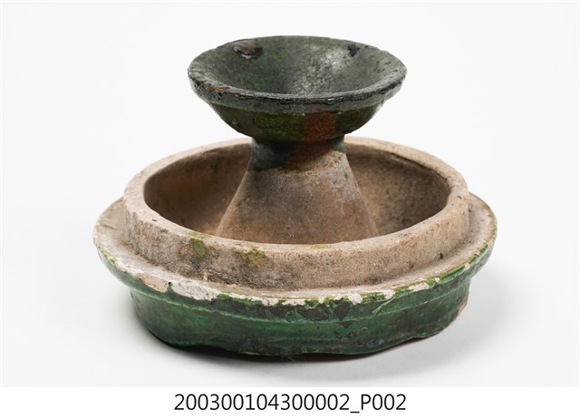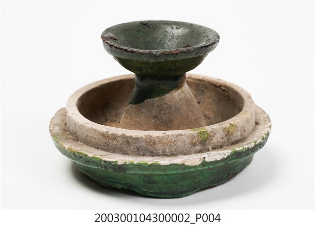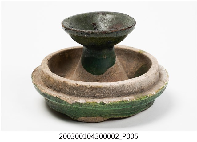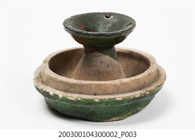 本件綠釉萬字紋燈閣燈座為部件之2,長10.9公分,寬10.8公分,高6.7公分。外觀表面多呈灰褐色素面胎體,僅底座處與燈盞部分帶有綠釉。外型呈現2承盤設計,上承盤作口緣略為外侈之盞杯狀,杯內帶有使用後的燃燒黑痕。承盤下接上窄下寬之錐形柱,底座兼作下承盤使用,口緣內縮作立唇樣式,身側帶有環形出沿,用以與外罩套合。