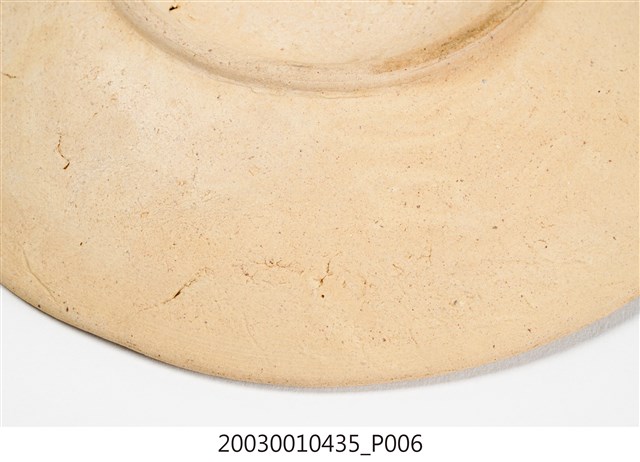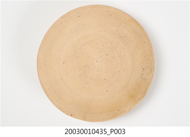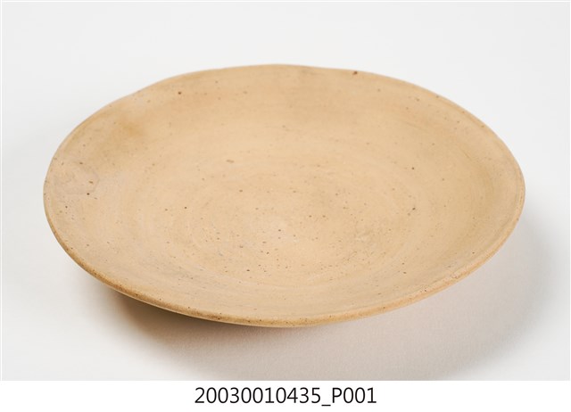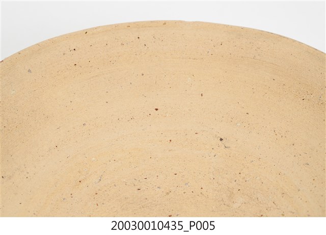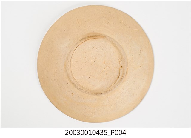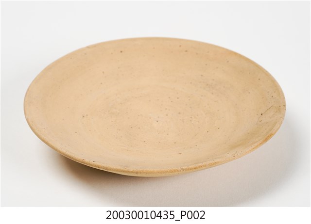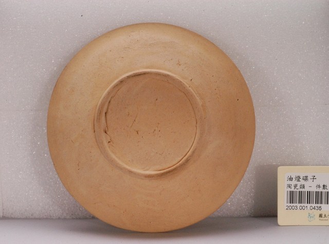 1.本件紅陶油燈碟係以細緻陶土製作而成,長12.1公分,寬12公分,高2.4公分。外觀呈現無釉素面淺紅褐色胎體,碟內帶有明顯之同心圓形製作痕跡。外型為上寬下窄,平口略為外侈,淺腹底帶圈足之碟形器。本件油燈碟為日常平民使用之實用器,直接於碟內添加燈油後,放置燈芯點燃即可作照明使用。本件油燈碟與2003.001.0434、2003.001.0436之胎土與形制相同應該同批出產之關聯器。2.臺灣在電燈尚未普及的時代,係以蠟燭、電石、植物油與煤油等燃料作夜間照明使用。油燈碟造型簡單樸素,多為日常平民之實用器,其