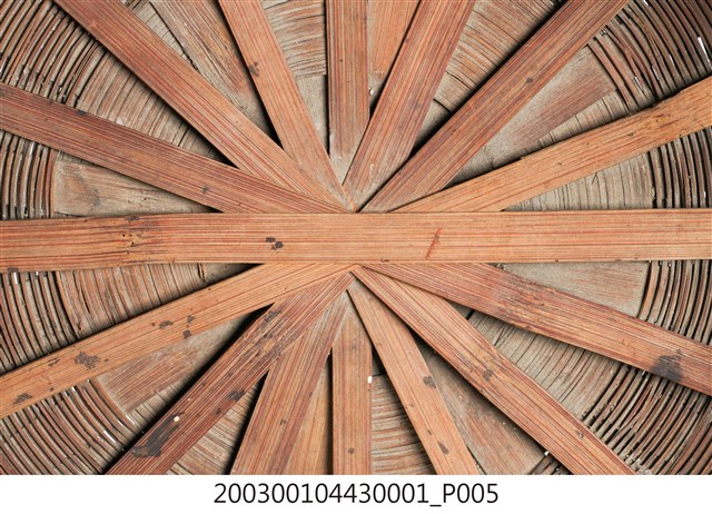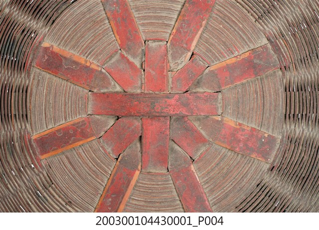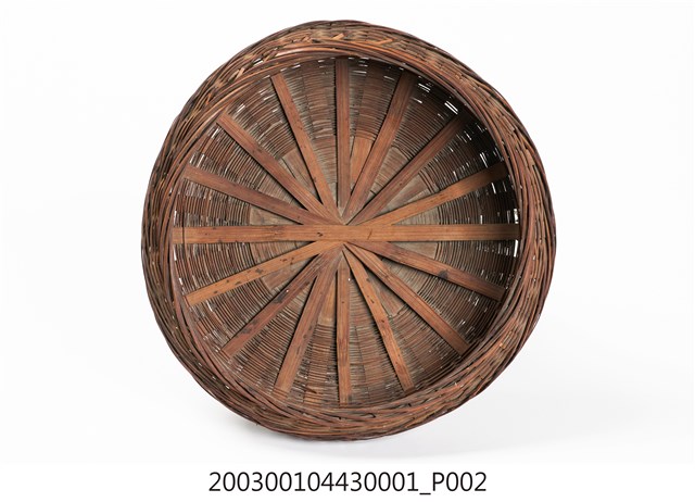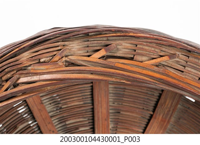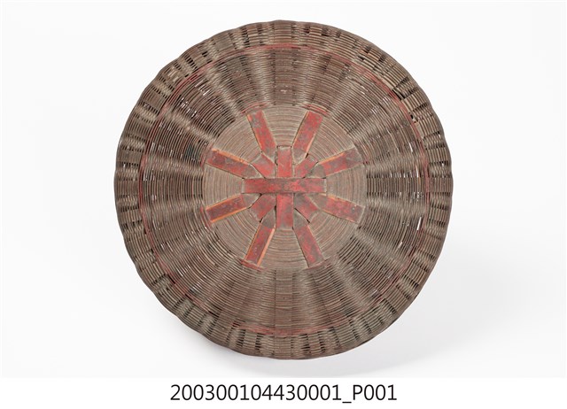 1.本件竹編𣛮籃籃蓋為附方形提把圓形𣛮籃的籃蓋,採密編的平編方式完成,籃蓋紋樣呈中心向外放射狀的紋路外觀上褐色漆,整體保存完整。2.𣛮籃多以竹編製做,主要功能是供放置食物、祭祀品,精緻者髹漆圖繪做為禮籃。𣛮籃依需要做成大小不一型式,小者可以手提,大者在提把上做一圈孔,方便插入扁擔或棍棒兩人提扛。