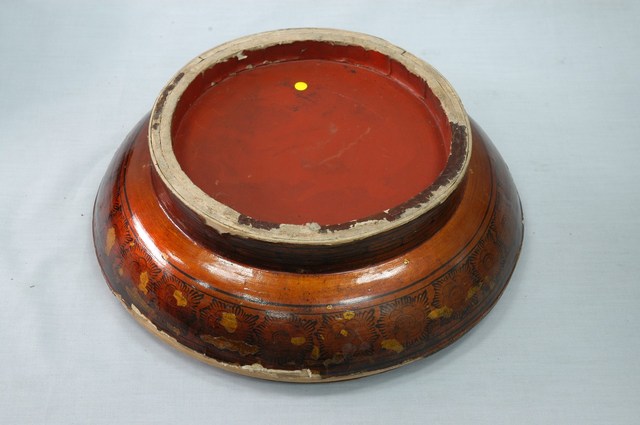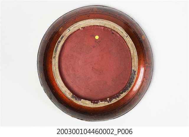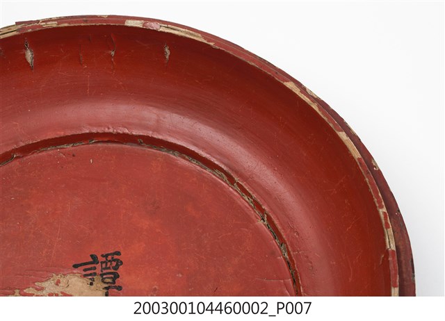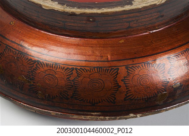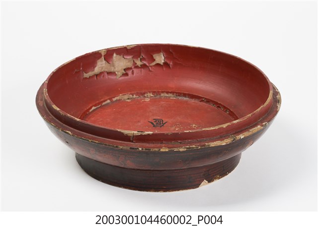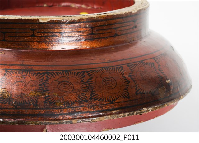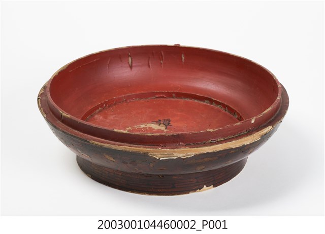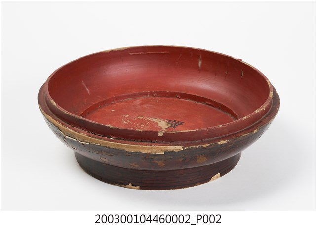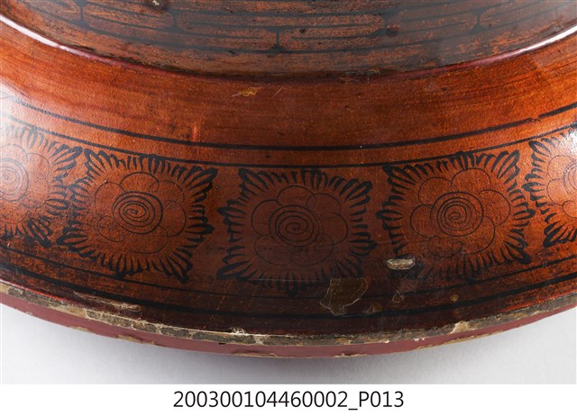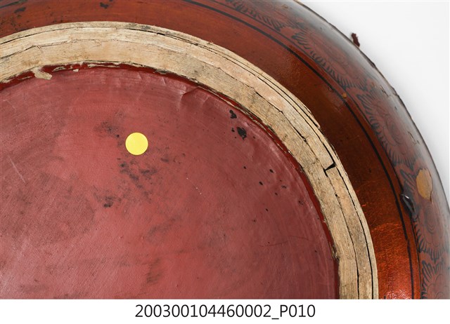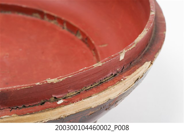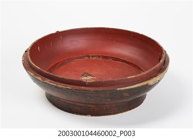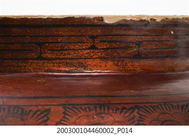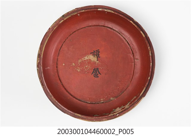 1.本件木製譚奩盒的盒身,為木製胎體的漆器製品,圓形造型,外表有精緻的圖案,因年代老舊,已看不清楚圖案。盒身外部為多種圖案的漆畫,內部塗上紅漆,盒身底部有墊圈,是由多層的木片所圈足而成,盒身開口邊緣有多處輕微破損情形,底部有黑色字體「譚奩」2字。2.奩盒是古代盛放梳粧用品或菜餚果品的盒子。
