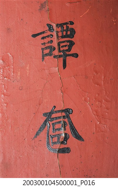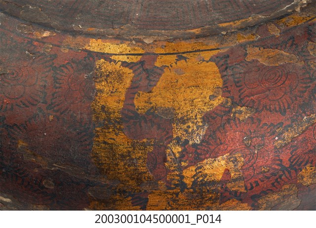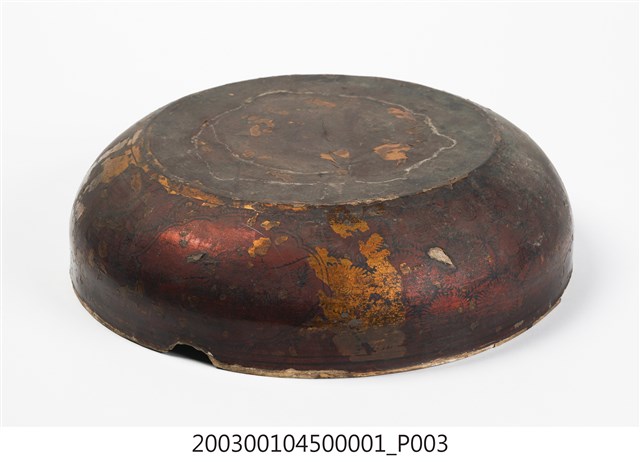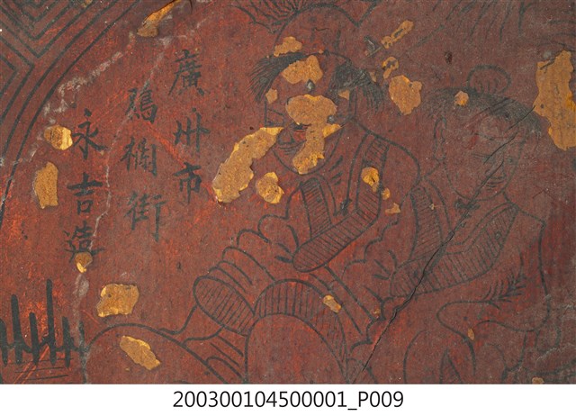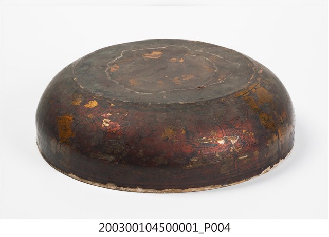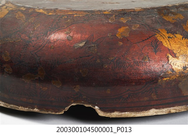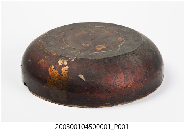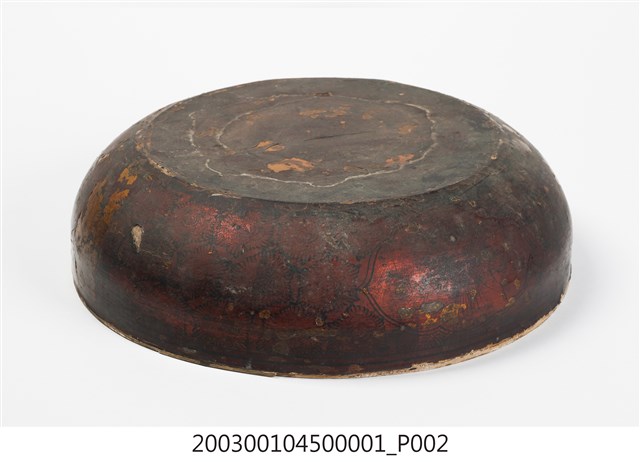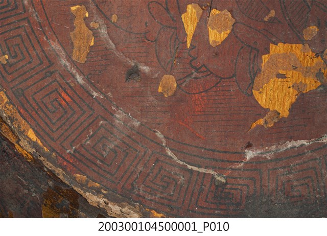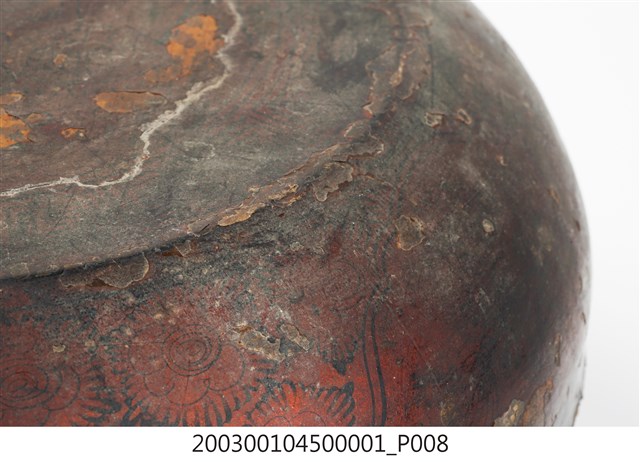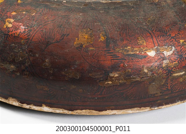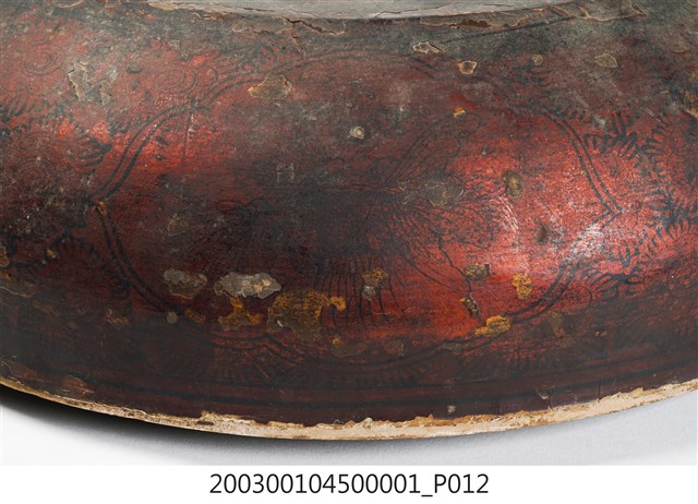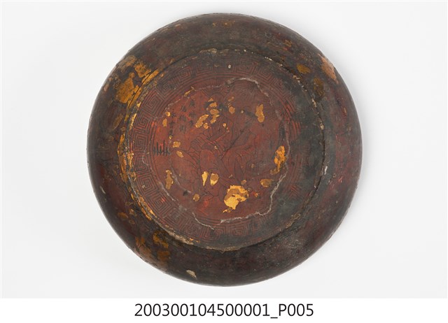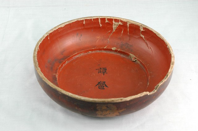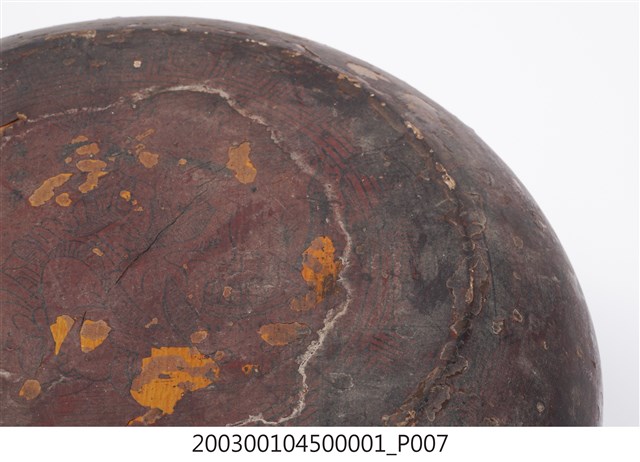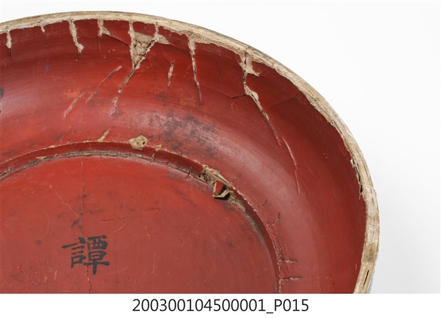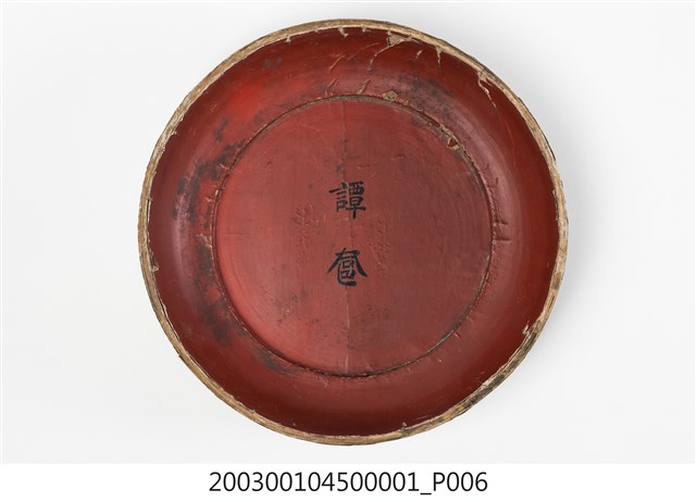 1.本件是木製譚奩盒的盒蓋,為木製胎體的漆器製品,圓形造型,外表有精緻的圖案,因年代老舊,已看不清楚圖案。盒蓋外部為多種圖案的漆畫,內部塗上紅漆,盒蓋邊緣有一凹槽缺口,方便打開盒蓋用途,底部有黑色字體「譚奩」2字,盒蓋內部有多處裂痕,以及長期使用留下的污漬,盒蓋外觀也蒙上一層污漬。2.奩盒是古代盛放梳粧用品或菜餚果品的盒子。