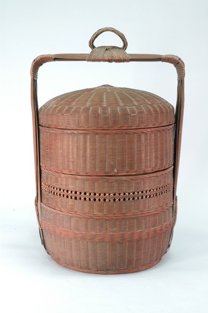 1.本件竹編三層𣛮籃籃身為圓形造形,附方形提把,提把正上方有圓形吊環。大致採密編的平編方式完成,第二層籃身中間有一圈鏤空編,為透氣用途。各層籃身上緣及下緣、籃蓋蓋緣採多條細竹條螺旋方式纏繞,外觀呈褐色,方形提把為五片竹片組成,左上、右上彎曲處以竹絲捆撲固定。提把上方有一圓形掛環,由多條細竹圈成,以竹絲捆挷固定於提把上,除籃蓋邊緣有些微破損外,𣛮籃籃身保存完整。