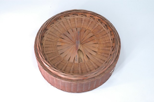 1.本件為圓形竹編三層𣛮籃籃身第一層,採密編的平編方式完成,籃身上緣及下緣採多條細竹條螺旋方式纏繞,外觀呈褐色,籃身貼有「春」字紅紙,已經褪色,底部外面有些微破損,2處寫有「文園」2字。2.𣛮籃多以竹編製做,主要功能是供放置食物、祭祀品,精緻者髹漆圖繪做為禮籃。𣛮籃依需要做成大小不一型式,小者可以手提,大者在提把上做一圈孔,方便插入扁擔或棍棒兩人提扛。