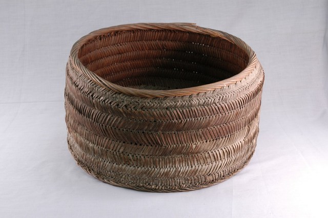 1.本件竹編什細籃,為寬圓桶造型的竹籮筐,使用粗細兩種竹篾條以斜交相編法編織而成,經、緯篾片密接無間隙,是本省客家庄婦女慣用的什細籃形式,籃身較閩南式的略高,邊緣及底邊以細竹條纏繞保護,通體找不到竹條收尾處接頭,製作極為細緻。2.什細籃通常形似臉盆,用來盛放婦女使用的針線衣料等什細。臺灣因竹材取得容易,臺灣原住民及明朝起移入的漢人已有自製實用的日常竹器用品,隨後陸續有竹製品從中國輸入販賣,至清朝光緒初年,已有臺南竹仔街、嘉義竹街、鹿港竹篾街等竹材、竹器店聚集成市的形成。