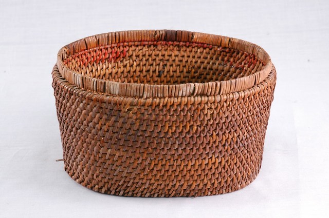 1.本件為竹編盒的盒身部分,以竹、籐編織而成,盒身呈橢圓形深桶狀,邊緣開闔處有金屬片釦鎖,本件文物大小與形制和早期的茶壺保溫籠器「茶壽」十分相似,盒蓋與盒身目前呈上下天地蓋分離狀態,但依整體外觀推測,盒蓋與盒身原來應是相連的翻蓋設計,只是因年代久遠,連接固定處斷裂。2.茶壽又稱茶巢,通常是利用竹、籐編織而成,農忙時節,農人工作時會將茶水裝在茶壺裡,再放在茶壽內保暖,通常蓋上有提環,並加金屬片釦鎖,以方便拿取移動。因為有的像鳥巢,巢與壽發音近似,取「壽」較雅氣。同時茶壽亦有108歲長壽之意。