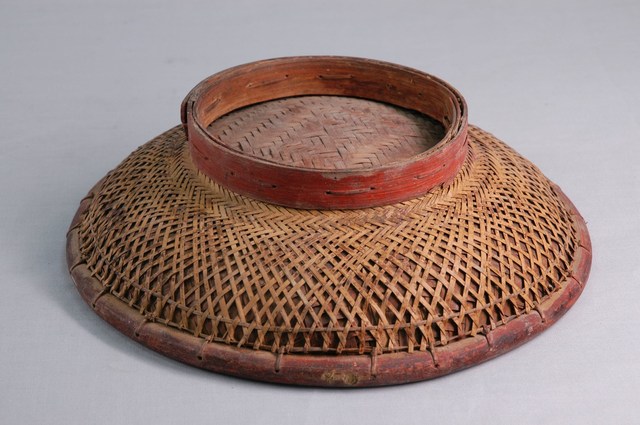 1.竹編高足供盤,盤面大而淺,底部編以高圈足撐托。盤面採內外雙層編,內層盤面以壓二挑二斜紋編織法完成,緣口內外兩側加上厚竹片夾合,打孔穿以籐皮纏繞固定收邊。外層以竹篾採菱形四角孔洞編法,圈足處以薄竹片繞圈接合後,打孔穿以籐皮纏繞固定收邊。盤面口緣與圈足處塗有紅色漆做裝飾,象徵喜氣。因年代久遠與經久使用,竹篾的光澤幾乎已盡失,塗紅漆的部分多有脫落。2.早年台灣農村社會時期,此類竹編高圈足圓盤常做為祭祀用供盤,擺放牲禮、敬果等,屬家中常見的竹編用具之一。