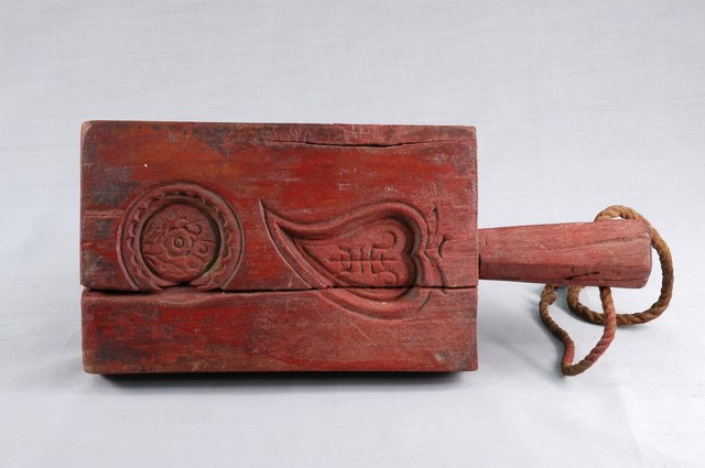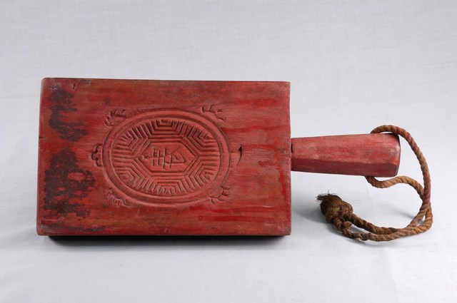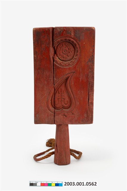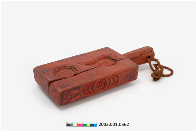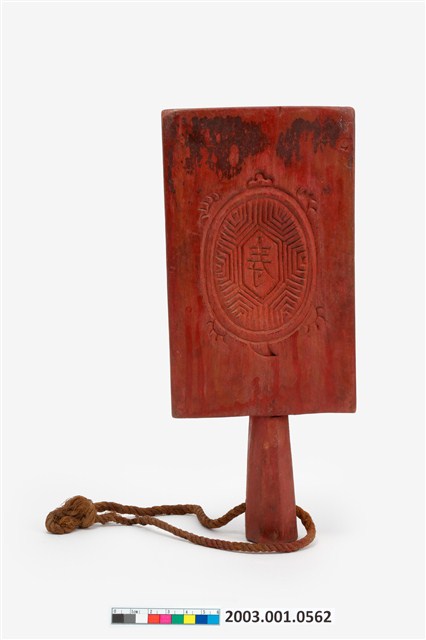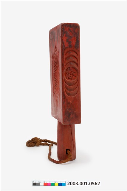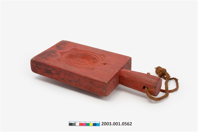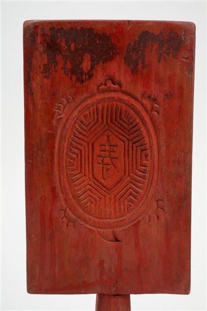 2003.001.0562 朱漆三面雕龜桃連錢紋帶柄粿印
