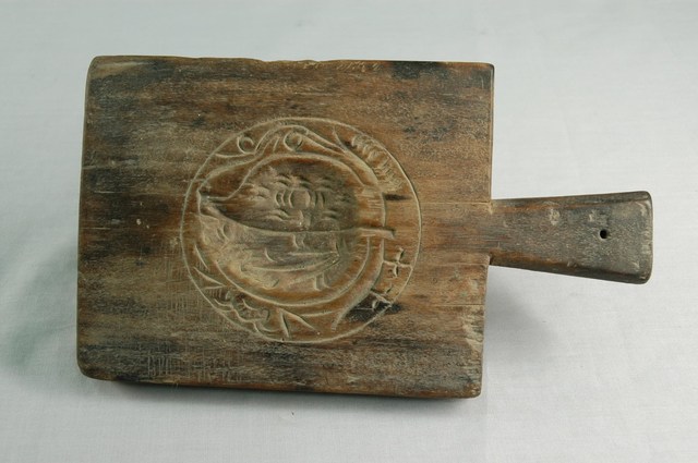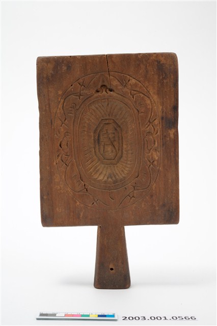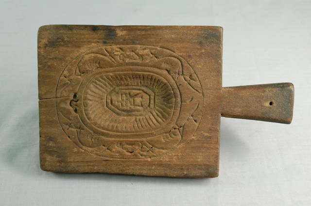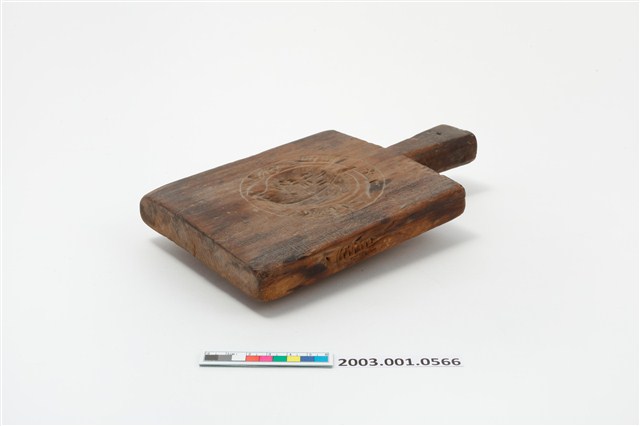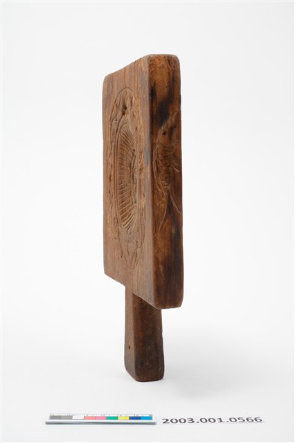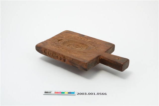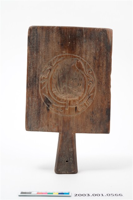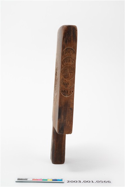 2003.001.0566 長方形四面雕龜桃連錢魚紋帶柄粿印