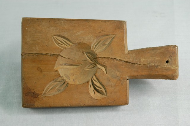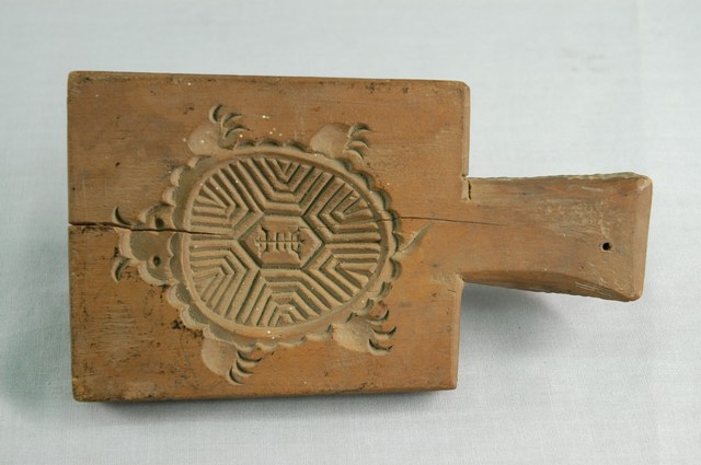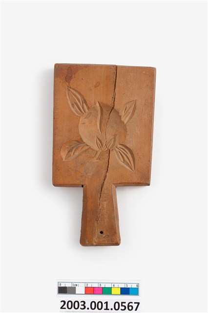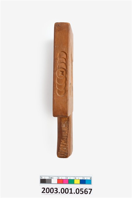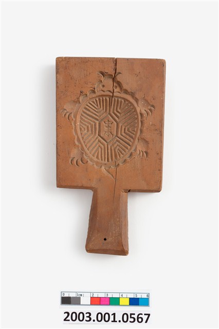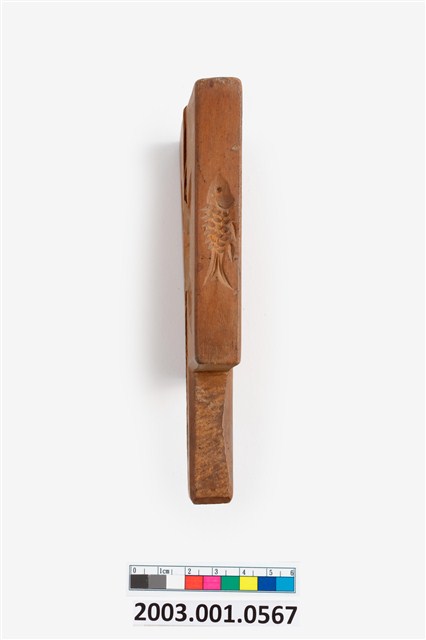 2003.001.0567 長方形四面雕龜桃連錢魚紋帶柄粿印