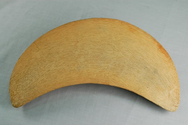 本組筊杯為竹製,一副兩片,以竹頭部位雕製,中央圓凸而兩端呈尖椎體,呈現新月外型,對半剖開之後而使每一片筊杯成為一面平坦而另一面浮凸之形式,浮凸一面的中央部位還留有竹頭凹洞以及鬚根磨平後之圓點等特徵。
