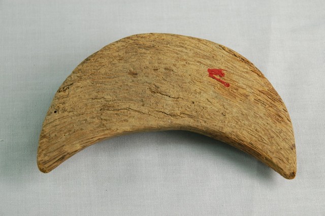本組筊杯為竹製,一副兩片,呈現新月外型,以竹頭部位雕製,中央圓凸而兩端呈尖椎體,對半剖開之後,使每一片筊杯成為一面平坦而另一面浮凸之形式。本組筊杯其中一片具有兩處竹頭生長出竹鞭被磨平處的深色圓點,經長年使用後而有明顯磨損之情形,但竹頭纖維紋路及圓點仍清晰可辨。本件平坦面畫有紅色顏料痕跡。