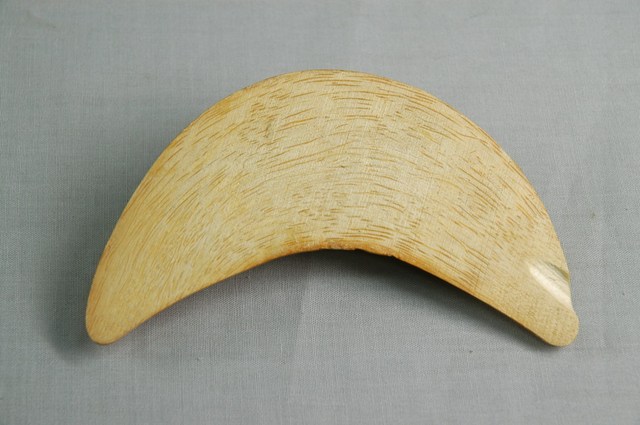 本組筊杯為竹製,一副兩片,以竹頭部位雕製,呈現新月外型,中央圓凸而兩端呈尖椎體,對半剖開之後而使每一片筊杯成為一面平坦而另一面浮凸之形式。浮凸一面的中央部位,雕磨之後所留下的竹頭節理花紋相當明顯,各有三處竹鞭生長基部所磨成的圓圈,大小不一,表面又施以透明漆而顯得光亮,對剖的平面沒有上漆,纖維紋路清晰。