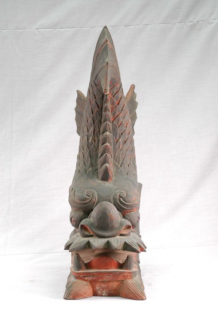 本件文物為鰲魚木雕組的其中一件。鰲魚在臺灣傳統題材中為龍生九子之一,龍頭魚身,好吞火、吐水,因此通常用於屋脊兩端以剪黏或泥塑製作,或通樑下木雕雀替。本組鰲魚頭下尾上為直立之姿,此種造型多見於廣東,臺灣未見。本組木雕底部為平面,可立,背面完整雕刻,無與其他建築構件接合面或卡榫做法,此種造型適用於屋脊,以底面黏合,但廣東屋脊亦以泥塑或交趾陶製作,不用木雕,做為屋脊木雕仍需在龍頭下部另做底座與屋脊接合。本組文物若下部無切割或斷裂痕跡,較可能是仿建築屋脊鰲魚所做擺飾品。