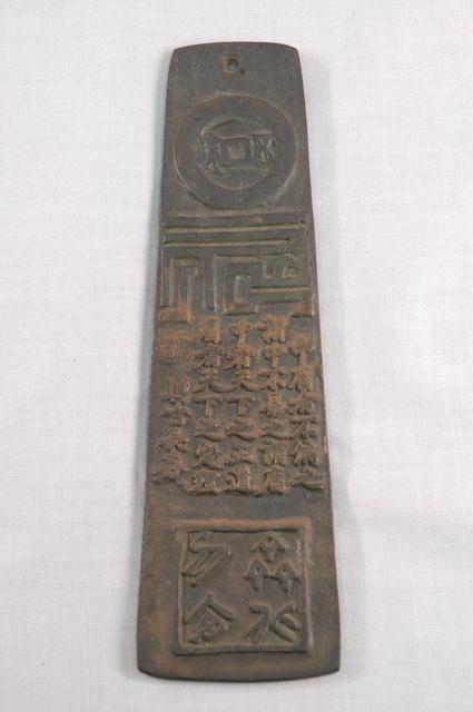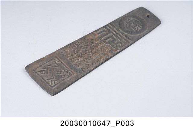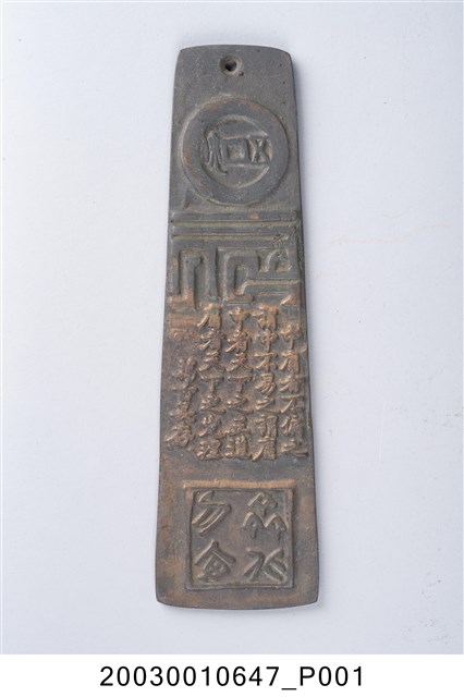 1.本件銅牌書文腰飾長5.7公分,寬19.8公分,高0.6公分,通體以黃銅鑄造而成,外形呈上窄下寬之長梯形,形似玉錛,作雙面圖紋,頂端帶有圓形透孔。一面上段部作銅錢圖紋內撰「□□主人」,中段鑄有陽刻書文「夫天下萬物從道而全世間萬事從理而行道理者天下之大本也 天地長春」,下段則以凸起圓形內採陰刻篆書「福」字樣。另一面上段部作銅錢圖紋內撰「五銖」,中段鑄有陽刻書文「中庸者不偏之為中不易之為庸中者天下之正道庸者天下之定理 萬古長存」,下段則作方形陰刻印篆「齊北勿□」字樣。2.本件藏品應為文人模仿腰牌或玉錛腰飾形制而鑄造出帶有書文字樣的銅製腰飾,與2003.001.0646之藏品為相同形制、字樣之銅牌。