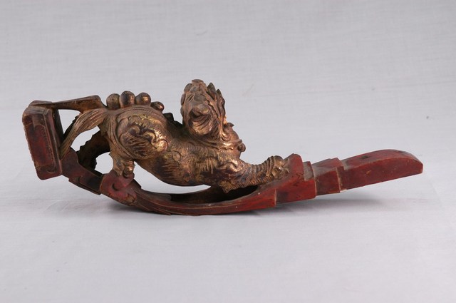 本文物為獅木雕組的一件,但本組獅並非同一對。為紅眠床床架之裝飾,頭下腳上的倒爬獅造型。二獅基本造型相同,耳上揚,背上鬃毛做圓珠狀,較似臺灣清光緒年間以後獅造型。獅子等精細雕刻是清代以後家具的特色,作法延續至今。本件木雕上紅色底漆,獅體再覆金漆,為清代以後床架常用的漆色。二獅鬃毛、耳朵等細節不同,與獅相連的構件細節亦有差異,可能是同一件床架上的兩組獅,或是不同床架的獅。唯臺灣紅眠床少用倒爬獅裝飾,本組文物可能來自中國。獅為傳統吉祥圖樣太獅少獅,諧音古高官太師與少師,象徵仕途順遂之意。