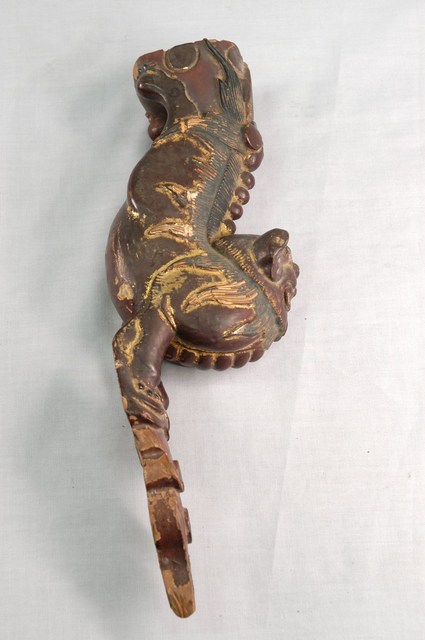 本文物為獅木雕組其中一件,本組兩件為同一對。為紅眠床床架之裝飾,頭下腳上的倒爬獅造型。二獅基本造型相同,耳上揚,背上鬃毛做圓珠狀,較似臺灣清光緒年間以後獅造型。獅子等精細雕刻是清代以後家具的特色,作法延續至今。木雕上紅褐色底漆,獅體再覆金漆。唯臺灣紅眠床少用倒爬獅裝飾,本組文物可能來自中國。本組文物皆有後期以鐵釘加固痕跡。獅為傳統吉祥圖樣太獅少獅,諧音古高官太師與少師,象徵仕途順遂之意。