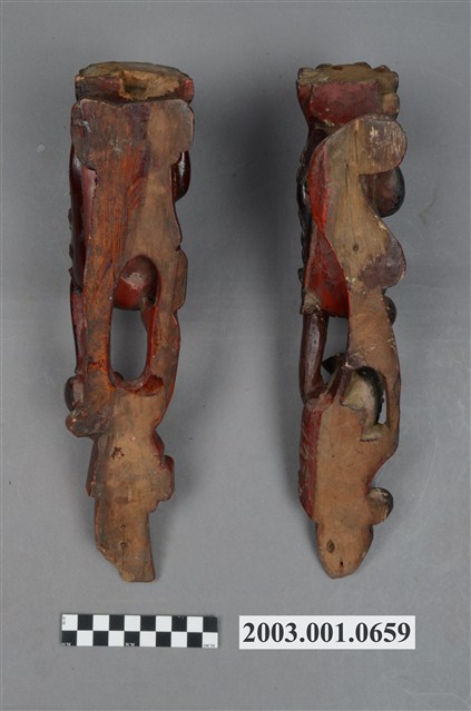 本文物為獅木雕組,一組兩件,但並非同一對。為紅眠床床架之裝飾,頭下腳上的倒爬獅造型。二獅基本造型相似,嘴張,耳外揚,背上鬃毛做圓珠狀,鈴鐺大呈圓球形。一為公獅抓綵帶,一為母獅帶小獅。獅子等精細雕刻是清代以後家具的特色,作法延續至今。本件木雕上紅色漆。二件獅鬃毛尾端等細節不同、與獅相連的構件細節亦有差異,加以二獅頭皆右轉,非左右成對,可能是同一件床架上的兩組獅,或是不同床架的獅。唯臺灣紅眠床少用倒爬獅裝飾,本組文物可能來自中國。獅為傳統吉祥圖樣太獅少獅,諧音古高官太師與少師,象徵仕途順遂之意。