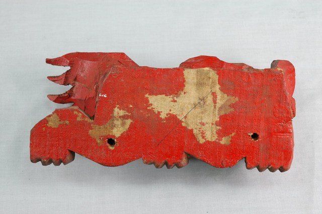 本文物為置放匾額的獅座組的一件,本組為同一對。傳統漢式廟宇建築的廟名匾等匾額,下方常以成對的獅座作為托架,此習俗沿用至今,現代的匾亦常以獅座為托架。為襯托匾額,獅頭需為對看姿態,眼神朝向中間匾額。本件為位於右側的獅座。獅座背面的頂部為平面,供匾額放置。本組屬臺灣傳統的獅座造型,獅子低身呈背負姿態。上漆紅漆。本組獅座以釘與後方壁面或通樑等構件結合,是戰後以後的作法。獅為傳統吉祥圖樣太獅少獅,諧音古高官太師與少師,象徵仕途順遂之意。