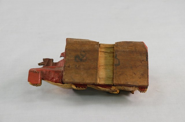 本文物為置放匾額的獅座組的一件,本組為同一對。傳統漢式廟宇建築的廟名匾等匾額,下方常以成對的獅座作為托架,此習俗沿用至今,現代的匾亦常以獅座為托架。為襯托匾額,獅頭需為對看姿態,眼神朝向中間匾額。本件為位於右側的獅座。獅座背面的頂部為平面,供匾額放置。本組屬臺灣傳統的獅座造型,獅子低身呈背負姿態。上漆紅色底漆,獅體再覆金漆。本組獅座以凹榫與後方通樑構件結合。獅為傳統吉祥圖樣太獅少獅,諧音古高官太師與少師,象徵仕途順遂之意。