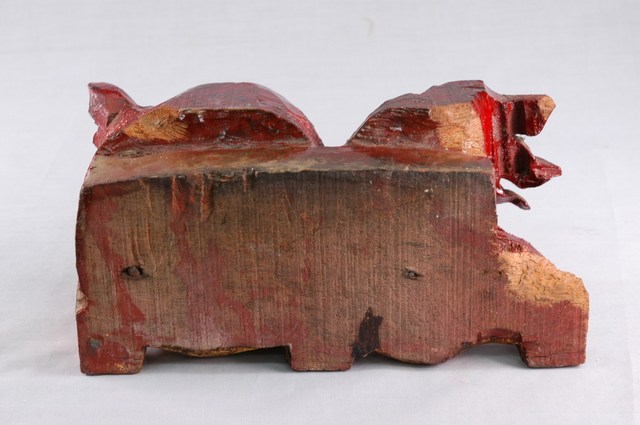 本文物為置放匾額的獅座。傳統漢式廟宇建築的廟名匾等匾額,下方常以成對的獅座作為托架,此習俗沿用至今,現代的匾亦常以獅座為托架。為襯托匾額,獅頭需為對看姿態,眼神朝向中間匾額。本件為位於左側的獅座。獅座背面的頂部為平面,供匾額放置。本組屬臺灣傳統的獅座造型,獅子低身呈背負姿態。上漆紅色底漆,獅體覆金漆,眼、牙再塗白、黑漆,最外面加上亮光漆層。黑白眼、牙及亮光漆的作法為戰後出現。本組獅座以釘與後方壁面或通樑等構件結合,亦是戰後以後的作法。獅為傳統吉祥圖樣太獅少獅,諧音古高官太師與少師,象徵仕途順遂之意。