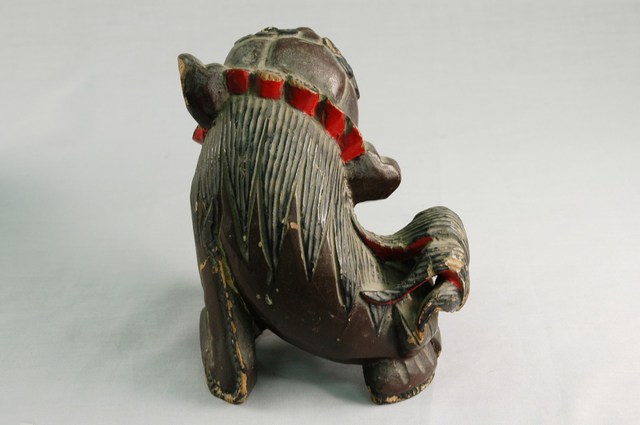 本文物為獅木雕組其中一件,本組兩件為同一對。獅為圓雕,底面平整,應為立於桌面的擺飾藝品。二獅一公一母,本件為公獅,腳踩銅錢。獅頭大身小,後腳蹲前腳立起。造型耳上揚,嘴大開,腳踩銅錢,尾部鬃毛高舉,較似臺灣清光緒年間以後獅造型。木雕上褐色底漆,鬃毛為紅漆,口及尾下部施紅漆,牙塗白,點黑白眼,在臺灣為戰後做法。但亦可能來自中國。獅為傳統吉祥圖樣太獅少獅,諧音古高官太師與少師,象徵仕途順遂之意。