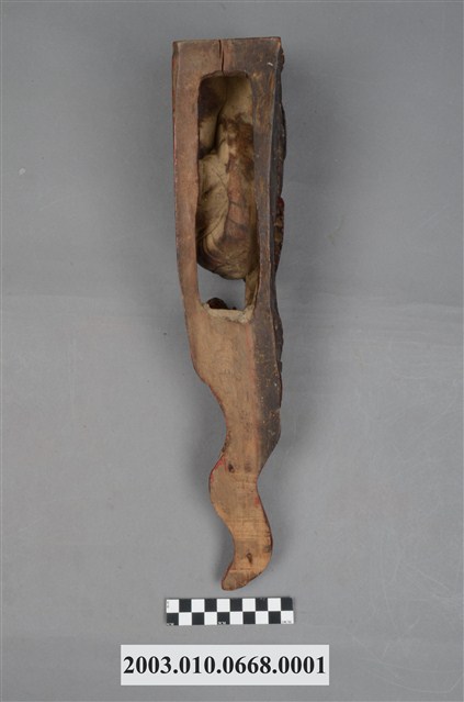 本文物為獅木雕組其中一件,本組兩件為同一對。為紅眠床床架之裝飾,頭下腳上的倒爬獅造型。二獅同為母獅帶小獅的太獅少獅造型,獅耳上揚,背上鬃毛做尖突狀。獅子等精細雕刻是清代以後家具的特色,作法延續至今。本件木雕上紅色底漆,獅體正面鬃毛部分覆金漆。唯臺灣紅眠床少用倒爬獅裝飾,本組文物可能來自中國。獅為傳統吉祥圖樣太獅少獅,諧音古高官太師與少師,象徵仕途順遂之意。