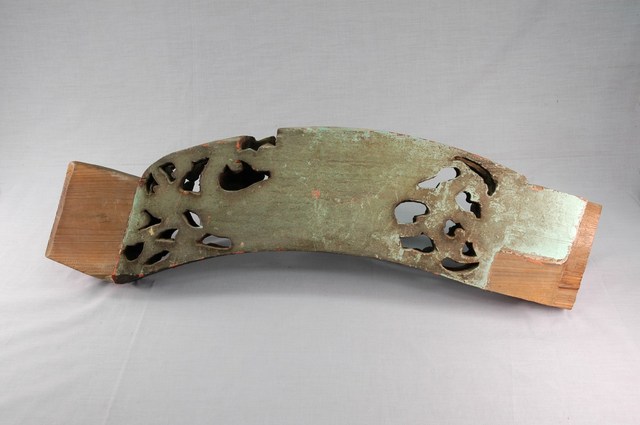 為傳統建築木構件,為束隨。束隨是位在束木下方的構件,作用與束木相同,是連結兩瓜柱以穩定瓜柱的構件。本件束隨正面透雕兔,背景為蕉葉及靈芝題材。木雕面施以紅、綠彩,大部剝落,另一面未雕,施青彩。此種彩較近日本時代中部彩繪風格。束隨兩端未施彩部分為嵌入瓜柱或斗拱的位置。兔是傳統吉祥動物,以其多胎象徵多子,以及月中玉兔象徵長壽。靈芝亦象徵長壽。蕉葉則取香蕉多果,象徵多子之意。