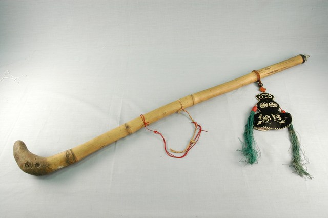 1.本物件為旱煙斗及煙草袋,共有旱煙斗與煙草袋兩部分,煙斗為竹子製成,外觀上有明顯的竹節,煙鍋處與煙桿一體成形,煙嘴處為金屬材質。煙草袋呈現葫蘆造型,上有多種顏色的絲線,並繡有諸多花草圖樣,繫於煙桿上。