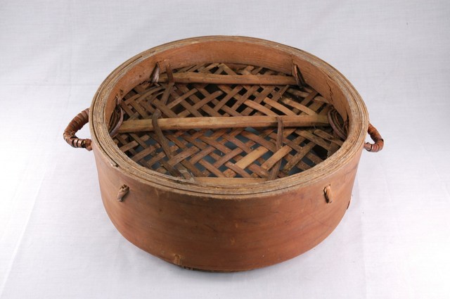 底層蒸籠,以木片製作籠身,將匏成片狀的木片一層層箍緊做成籠身的外圈,以寬的竹片烤彎作為內圈,接著用竹片編結成籠身的底部,並以竹條加固結構,用來擺放食材,並提供足夠的空隙讓水蒸氣流通其中。器形固定後在籠身穿孔以藤繩匝緊,最後在籠身兩側繫上藤繩做成的耳,方便蒸煮時提取。