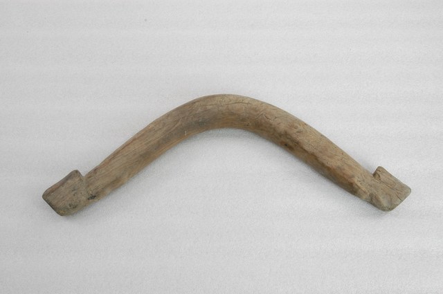 1.本物件為牛軛,木頭材質。該物件為一體成形的木製物件,兩端等高,中段向外彎曲,表面可見裂痕、兩端有人工鑿刻痕跡。