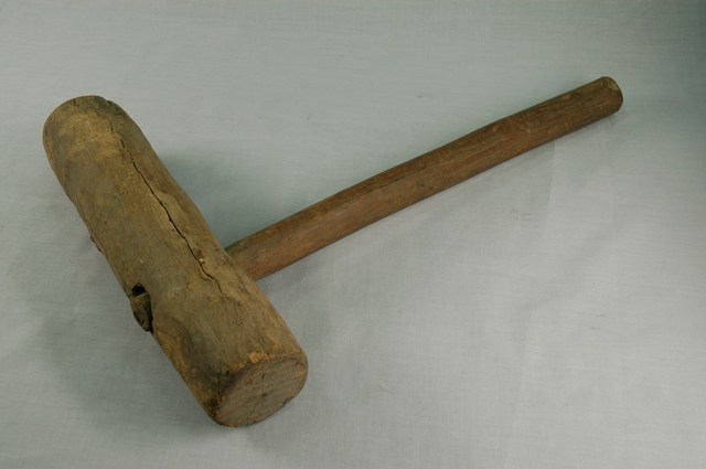 1.本物件是一支木材製成的槌子,圓柱狀槌頭與圓棒握柄以卡榫方式嵌合固定。作用是打軟稻草,結繩編器。