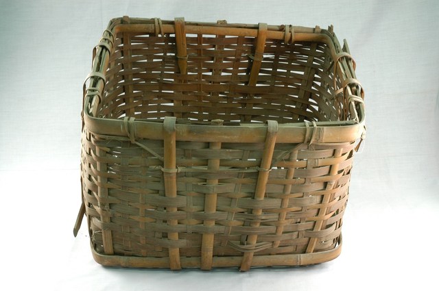 1.本件竹籠,為長方桶型,開口朝上,以竹篾片主要以平編法編織而成,底部及口緣加上寬竹框來加強固定籠身,籠身四面從口緣到底部又加上寬竹片來接連固定,以增加竹籠的承受力,過去農家將其作為儲放甘藷、蘿蔔等雜糧之使用。2. 臺灣因竹材取得容易,臺灣原住民及明朝起移入的漢民便已有自製簡單的竹器用品,隨後陸續有竹製品從中國輸入販賣,至清朝光緒初年,已有臺南竹仔街、嘉義竹街、鹿港竹篾街等竹材、竹器店聚集成市的形成。