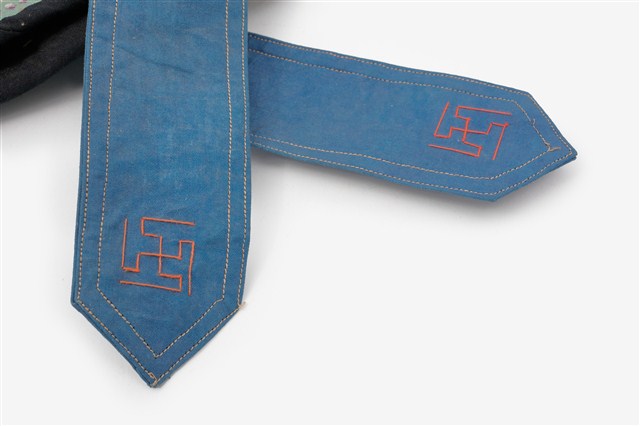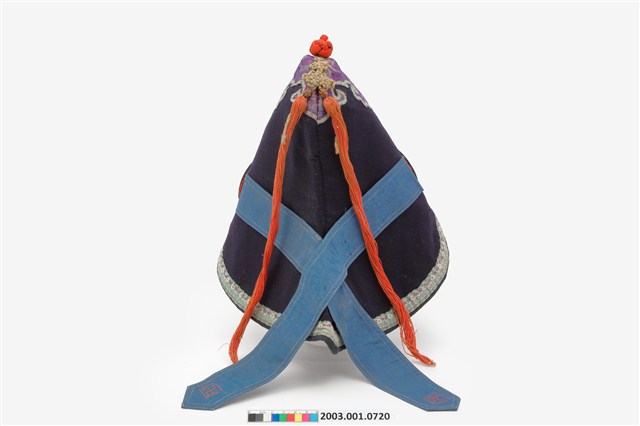 2003.001.0720 黑地貼布紅結頂綴銅佛帽花風帽