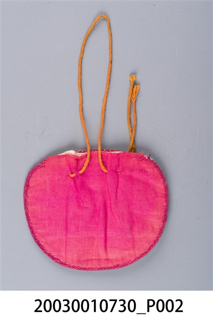 1. 本件為單層腰圓荷包,正面為黑緞,背面為桃紅布,僅正面繡有紋樣,並使用桃紅色線結邊,除了美觀,還可增加耐用度。紋樣方面,中心部分以水藍、深藍雙色線作搶針繡牡丹,寓意富貴。兩側以緞面繡作龜鹿紋右邊以淺綠、桃紅繡龜紋,龜象徵長壽;左邊以黃、藍兩色繡鹿紋,鹿與祿諧音。此外,使用紅、金線做釘線繡,裝飾龜吐得氣息及植物的莖,讓紋樣富有變化及貴氣。另外,在荷包上方有略微褪色的橘繩可用於束口。此件荷包使用痕跡明顯,在正面有多處破損露出裡布。2. 荷包有多種形式,常見的有雞心荷包、腰圓荷包、葫蘆荷包,可掛在腰間放置