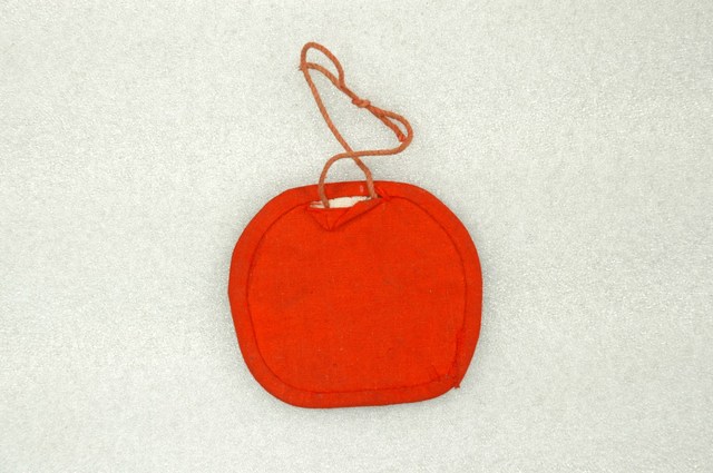 1.此件煙袋為圓形,正面為黑色底布,裡布為米色,背面為紅布。採用紅布包邊,上方有朱紅色掛繩方便佩掛。紋樣方面,採五色線以纏針、齊針繡有龜鹿紋、壽字紋、花卉紋。龜鹿紋象徵福祿,壽字紋表示長壽,此件煙袋寓意吉祥。保存情況上,此件煙袋正面有明顯破損,可看出米色裡布,壽字紋繡樣也有些脫落。2.本件購藏自許鉉雀女士。煙袋為早期先民常見配飾,有繩可佩掛在腰間,用以放置煙草,方便外出需要吸菸時取用。